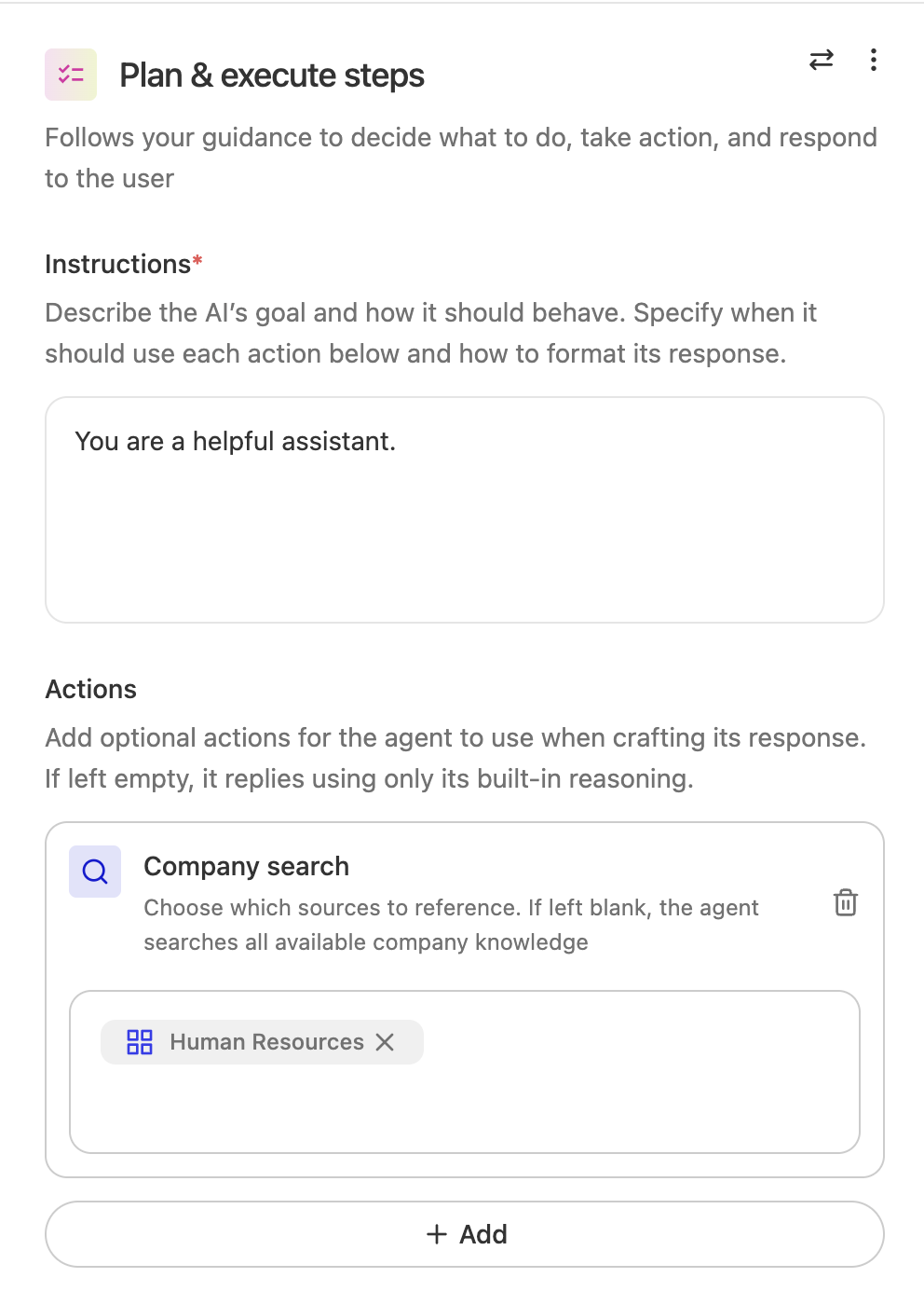 The most common use case for Plan & execute steps is building chatbots, as it is effective for handling a wide range of user inquiries. To build a chatbot, you can start with the default configuration, which provides the step with access to only the 'Company search' action. To ensure the step provides the most relevant and accurate answers, you can constrain exactly which documents, datasources, or folders that the search can pull from.