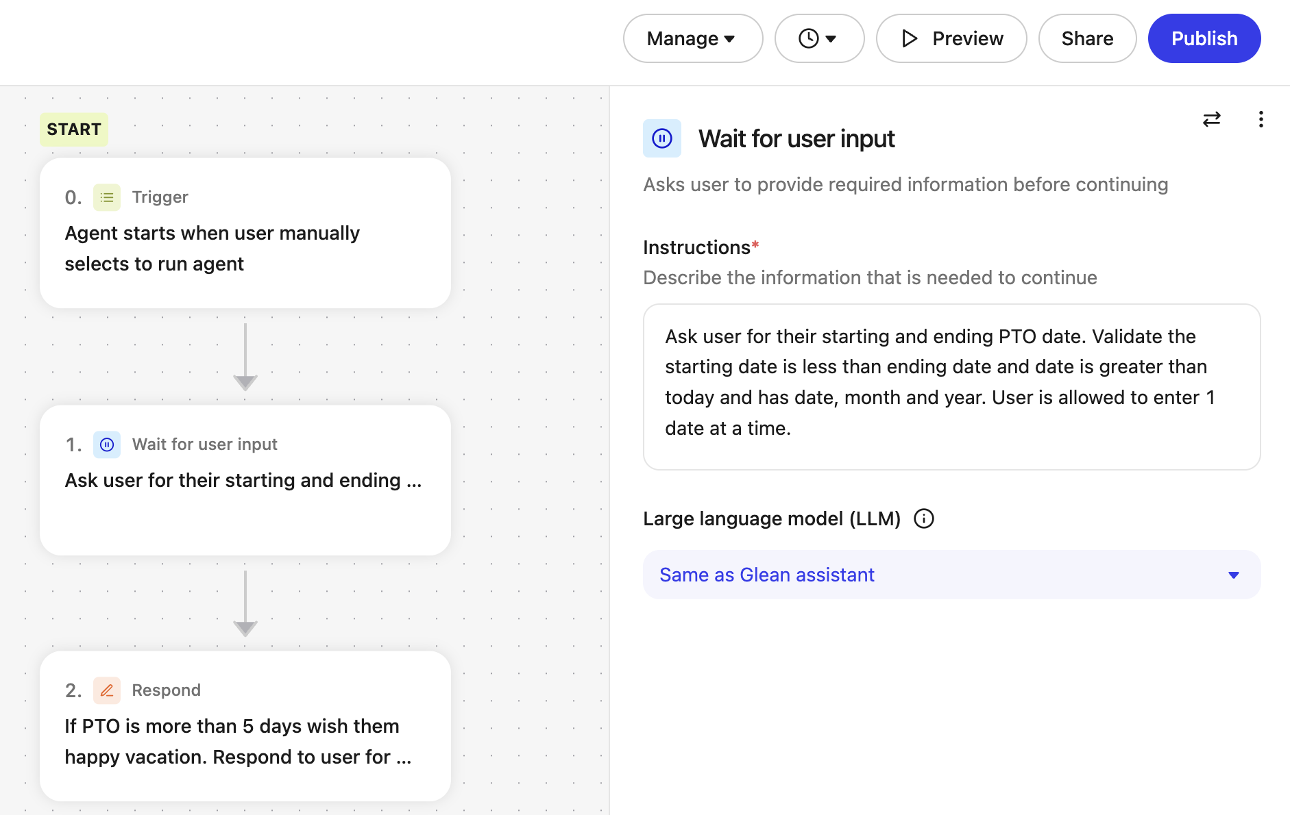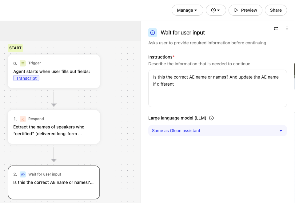 Glean’s Wait for user input action allows agents to pause execution at any point to collect information or confirmation directly from a user. This makes it possible to build workflows that incorporate real-time human interaction, unlocking new use cases that require critical gating or decision points.