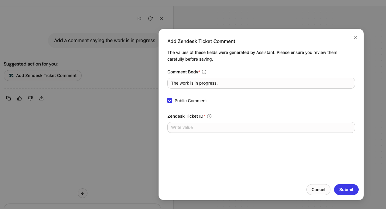 - Add the Zendesk Add Comment action to your agent.