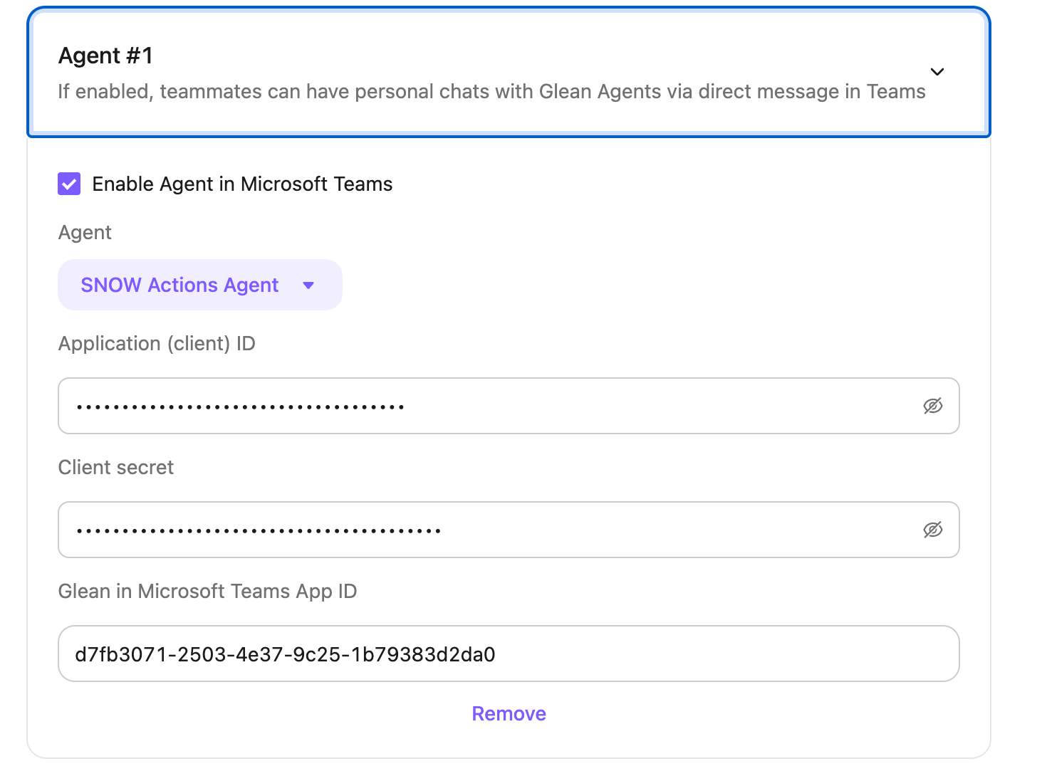 For example, if Agent#1 is assignedSNOW Actions Agent, an IT Agent which is built on Glean Agents platform with certain actions like create tickets, comment on a ticket and so on, then all the user interactions with the Agent#1 in MS Teams are withSNOW Actions Agent. -