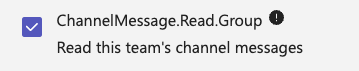 Go to “Permissions” in the left tab. Then go to “Team Permissions”, and select ChannelMessage.Read.Group. Also, go to “Chat/Meeting Permissions” and select “ChatMessage.Read.Chat” (These permissions are required for supporting the proactive mode in the future).