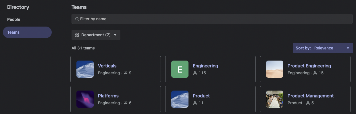 The team directory provides a central location where users can browse and discover teams across the organization. Teams appear alongside people in the directory, creating a comprehensive view of your organization's human resources. Within the directory, users can: