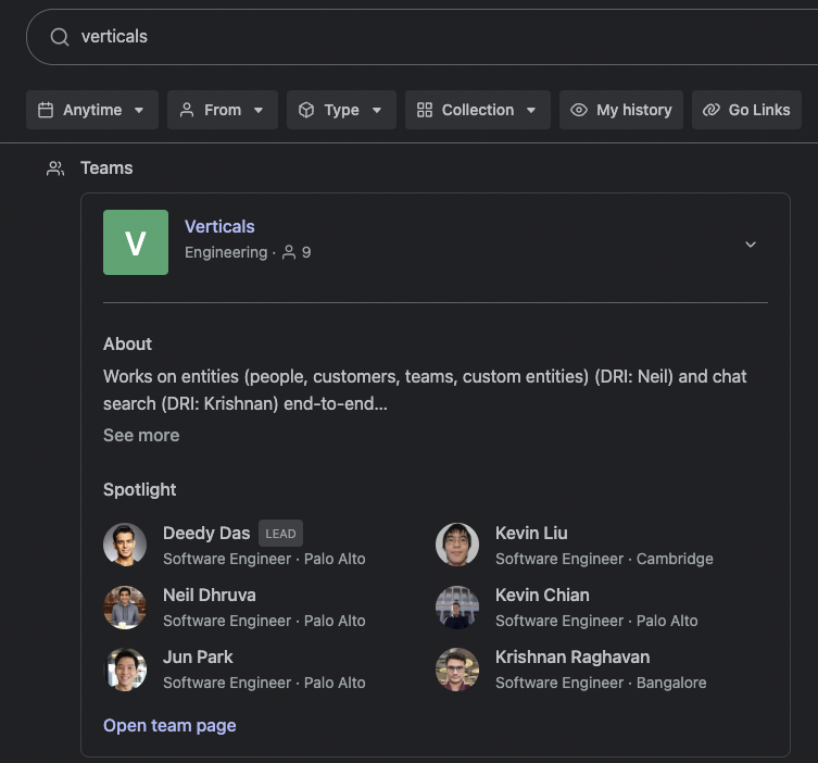 When teams appear in search results, they're displayed as expandable cards that provide a quick preview of the team. Expanding these cards reveals up to six team members, giving users immediate insight into team composition without leaving the search interface.