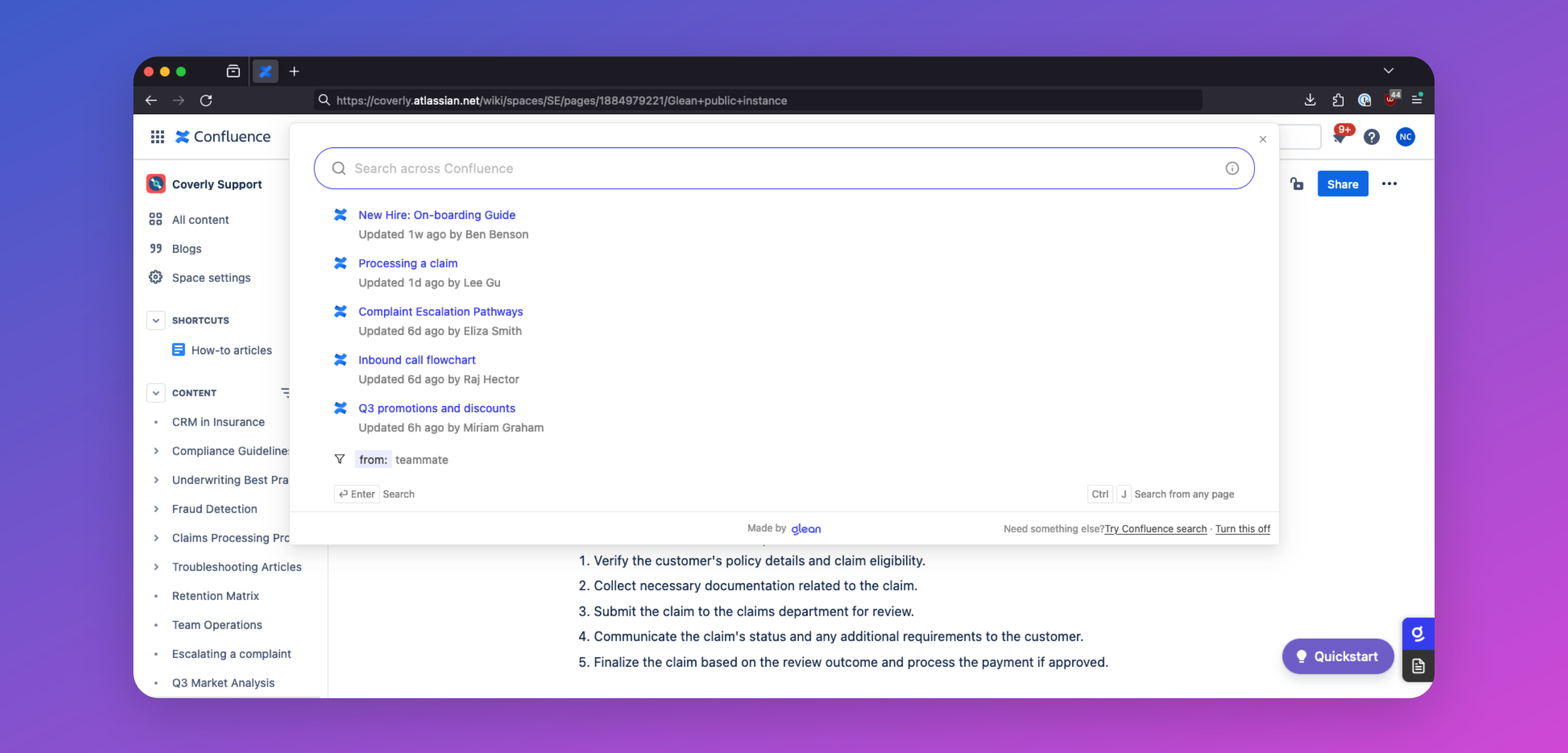 Glean can make searches within other apps better! Clicking or focusing the native search box on certain company-connected apps (like Jira, Confluence, and Google Drive) opens Glean search instantly in a modal dialog where typing continues to get Glean's more relevant results.