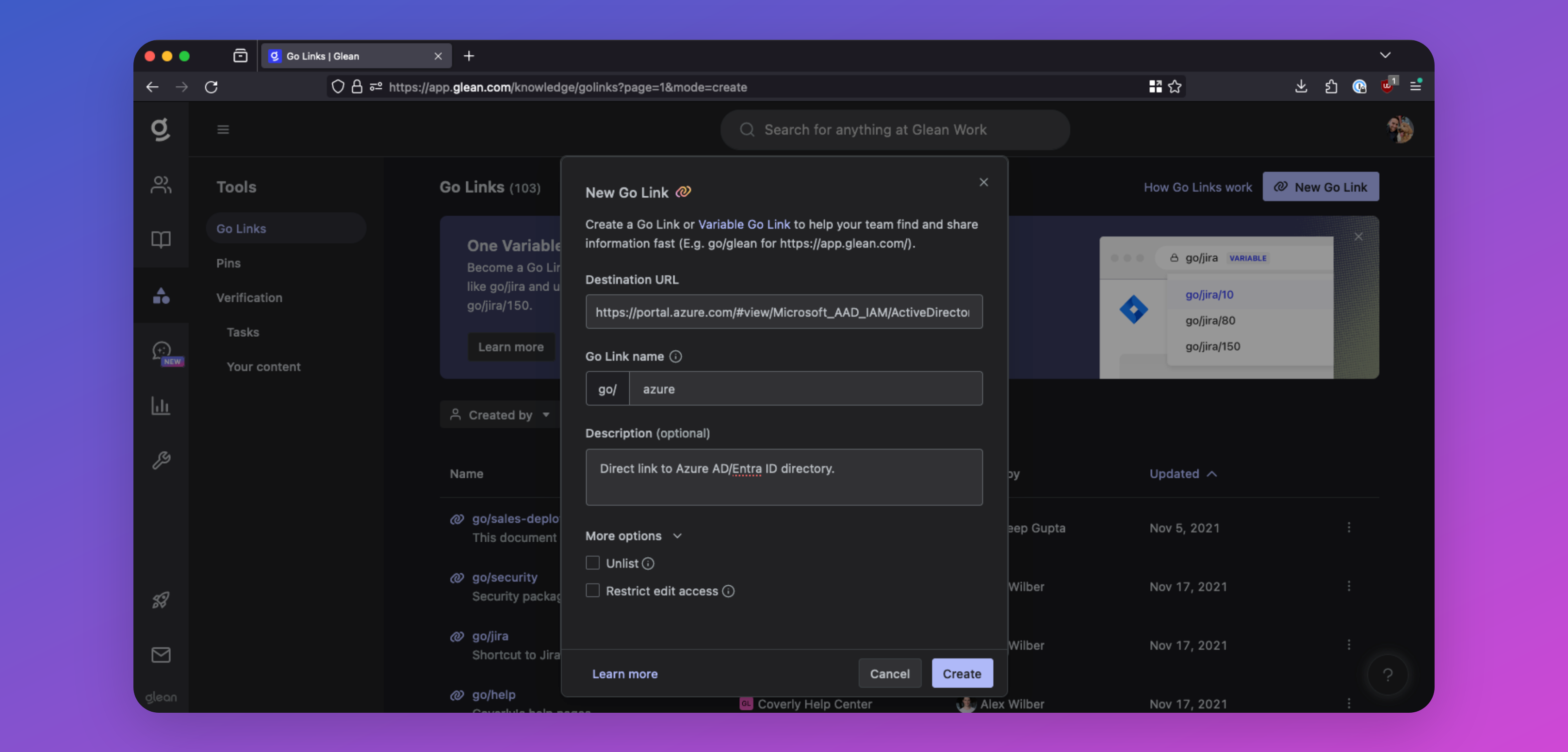 Go Links are short, memorable links that redirect to important URLs within your company. For example, you could create go/401k for your company’s 401k portal, go/it-help for your IT help desk, or go/sprint-planning for your Jira project.