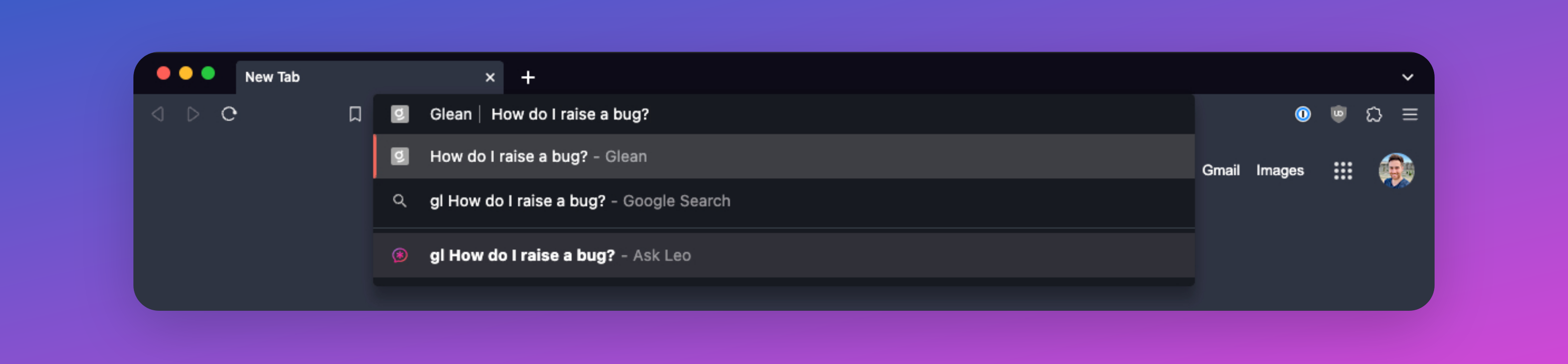 Type Gl+tab in any Chromium browser to search Glean directly from the URL bar.