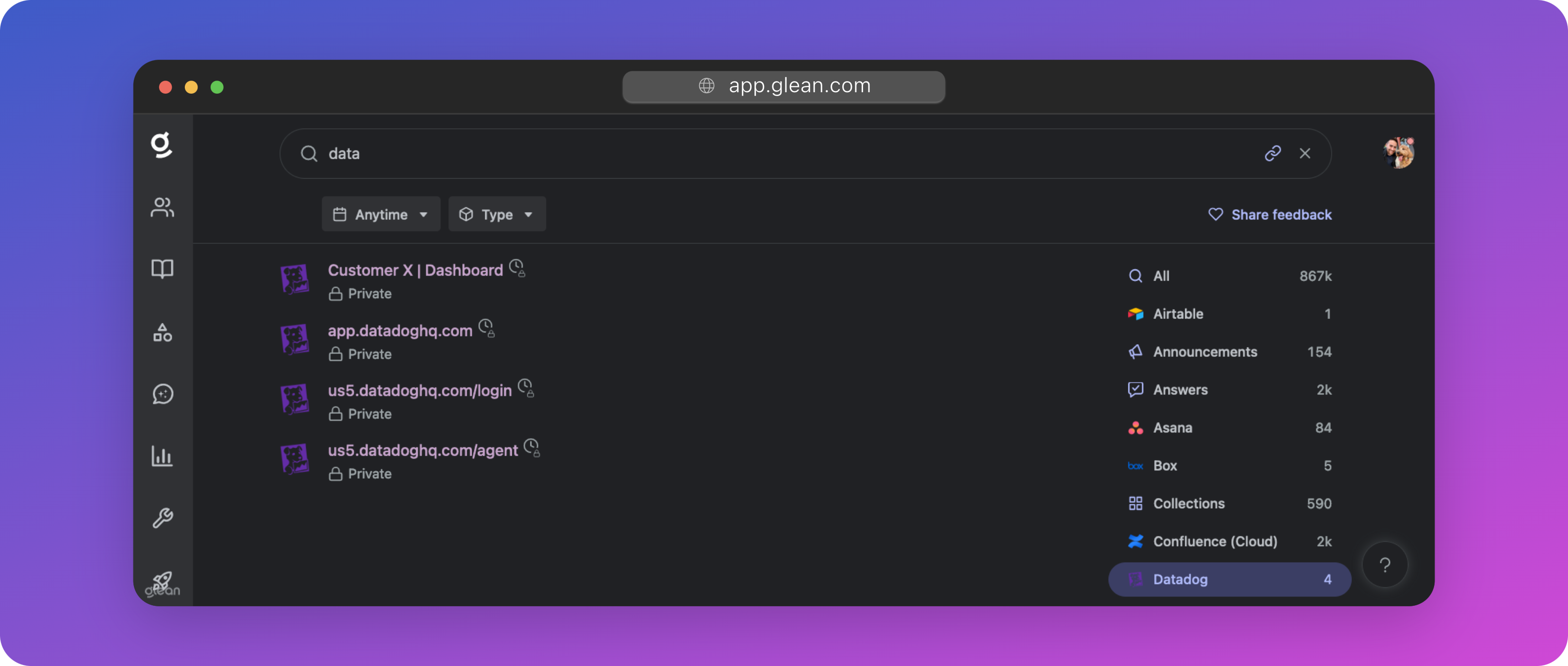 Enhanced search result personalization: Glean leverages activity data reported by the extension to learn the relevance of a document and its groupings within an application. This allows Glean to deliver a higher degree of personalization than without the browser extension.