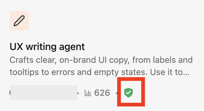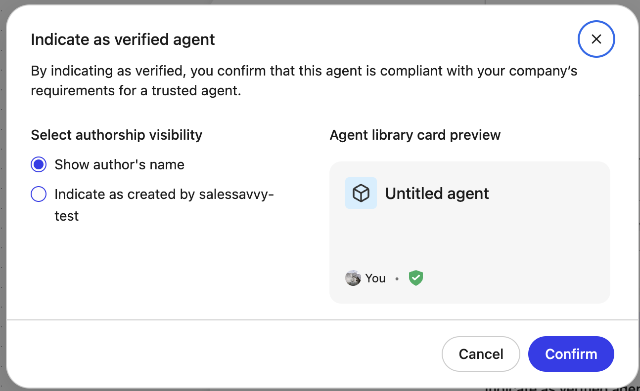 - A verified badge appears in the Agent Library and on the agent detail view.