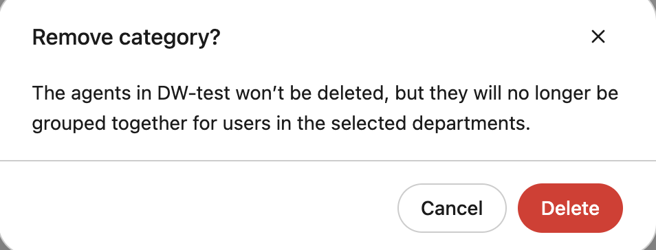 You can remove categories that are no longer needed to avoid clutter. Agents themselves remain available and will not appear under that category. To delete a category: