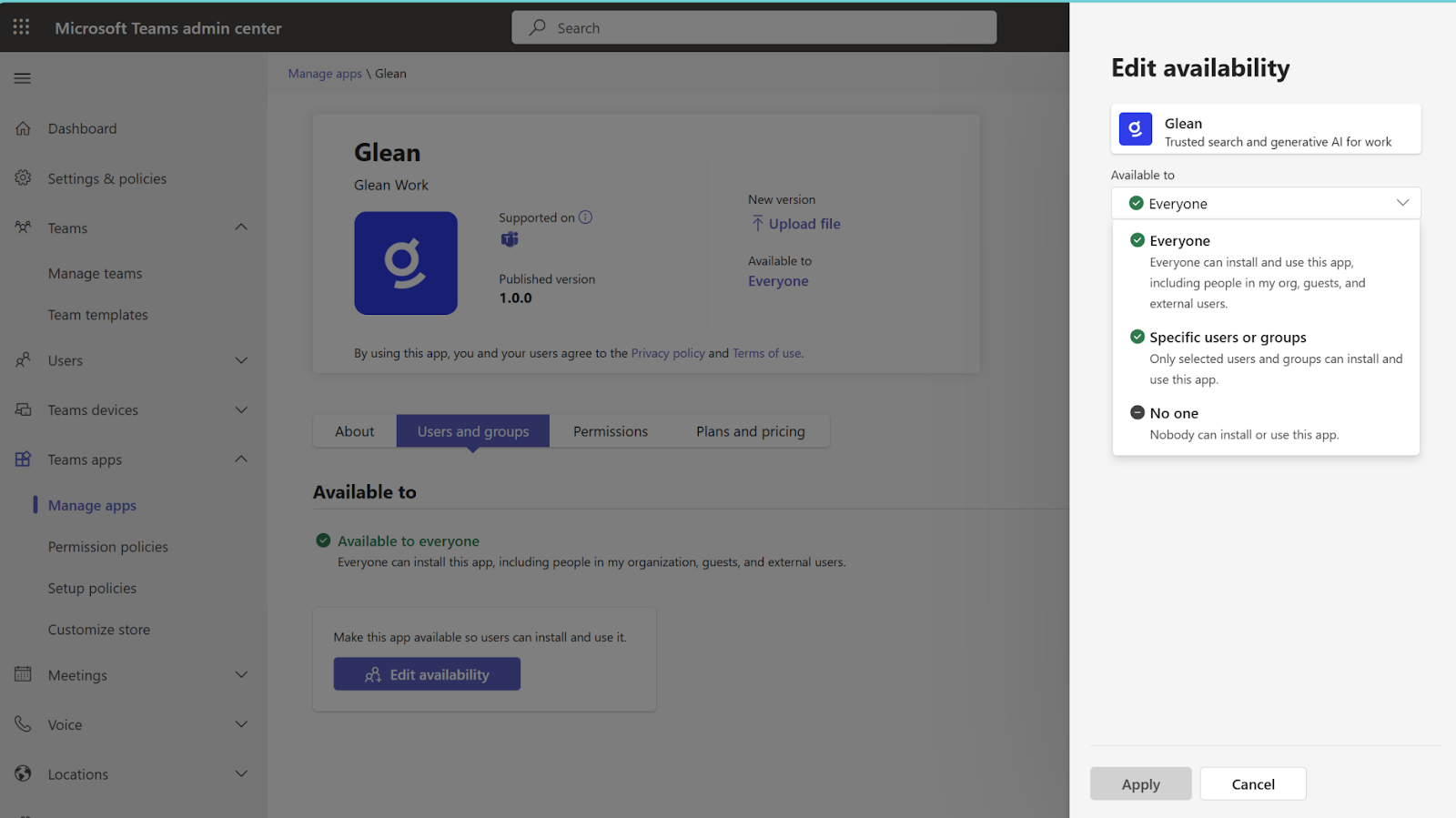 Follow these steps to deploy Glean to your organization or specific users via the Teams Admin Console.