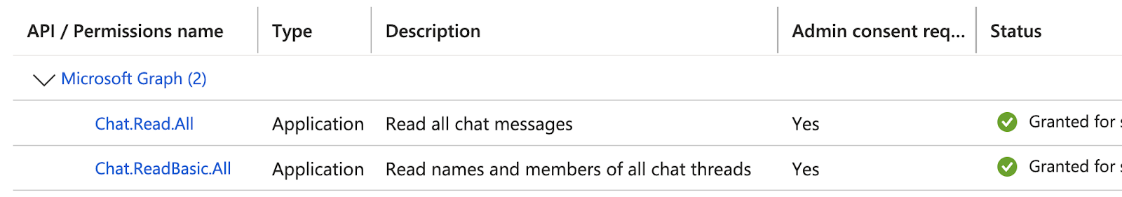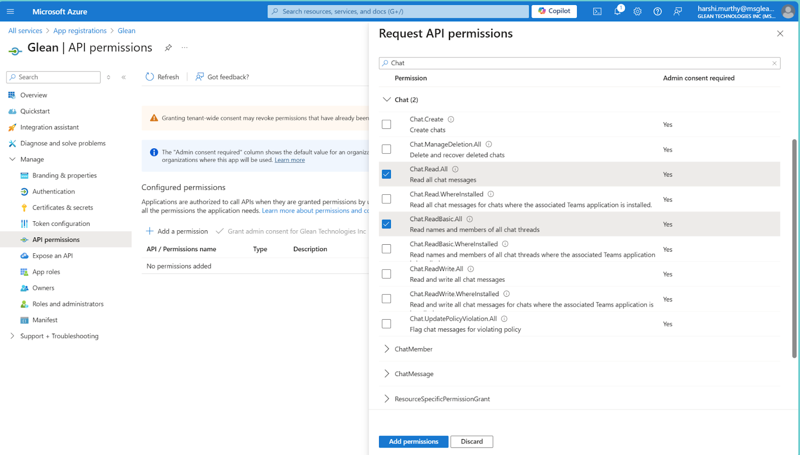 e. Select Application Permissions, search for Chat, and add the following: