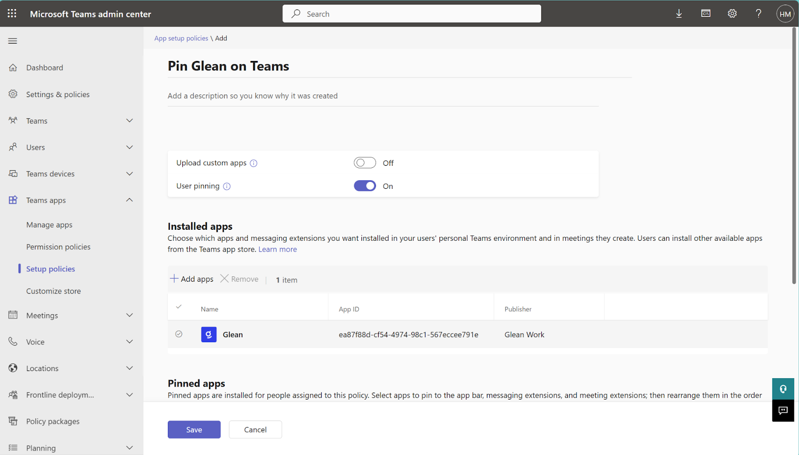c. Name the new policy as “Pin Glean in Microsoft Teams”.
