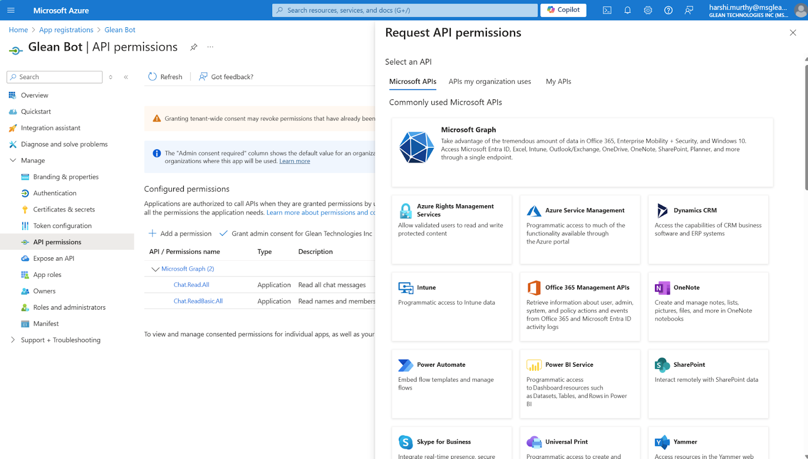 - Navigate to Azure Active Directory → App registrations and select the app registration you created for the Glean Microsoft Teams bot.