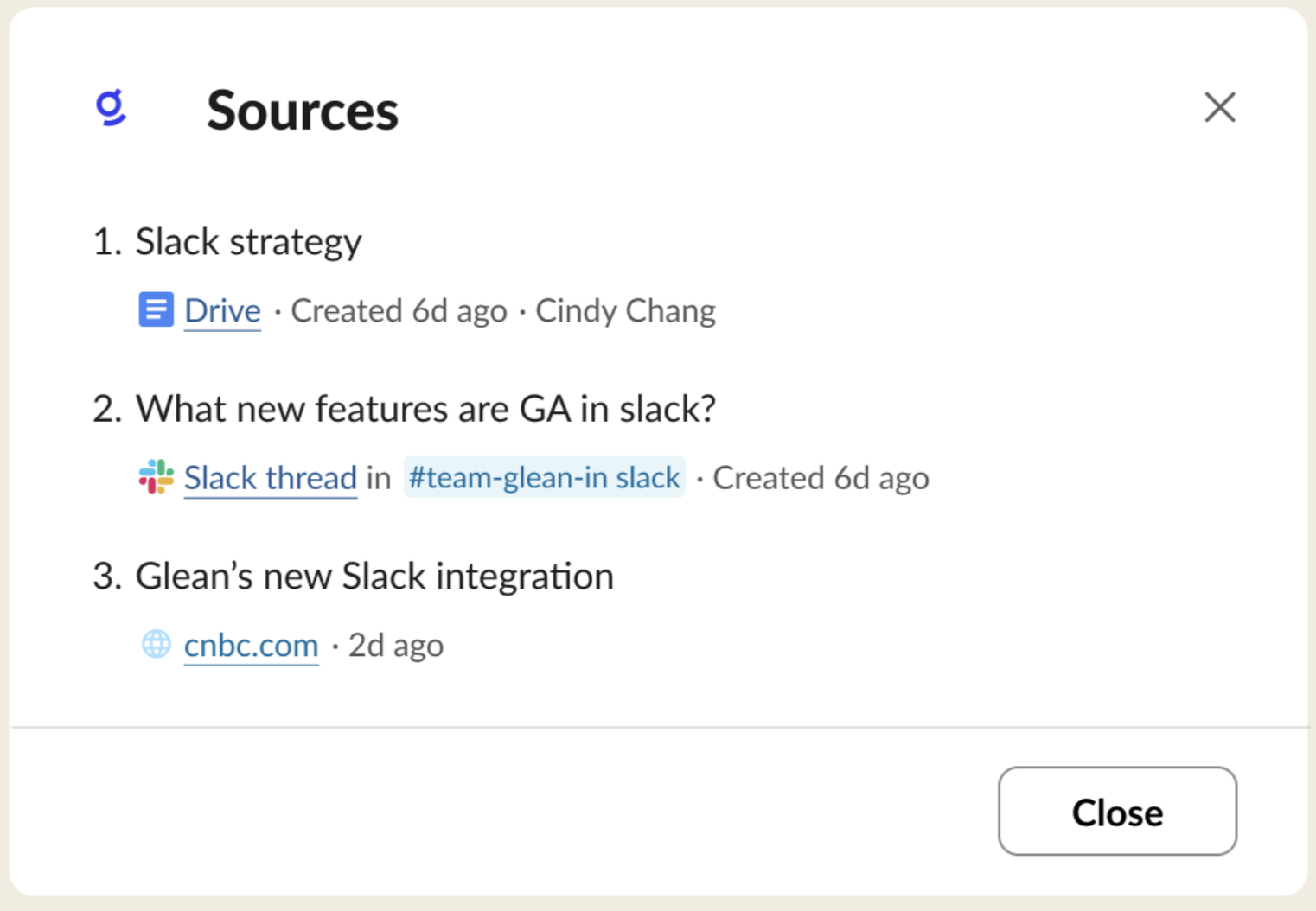 Users can open a sources modal from the Slack response to inspect the sources cited in Glean's answer.