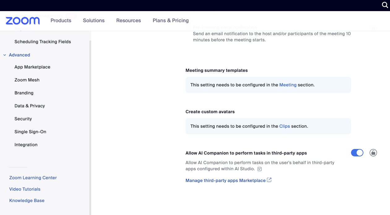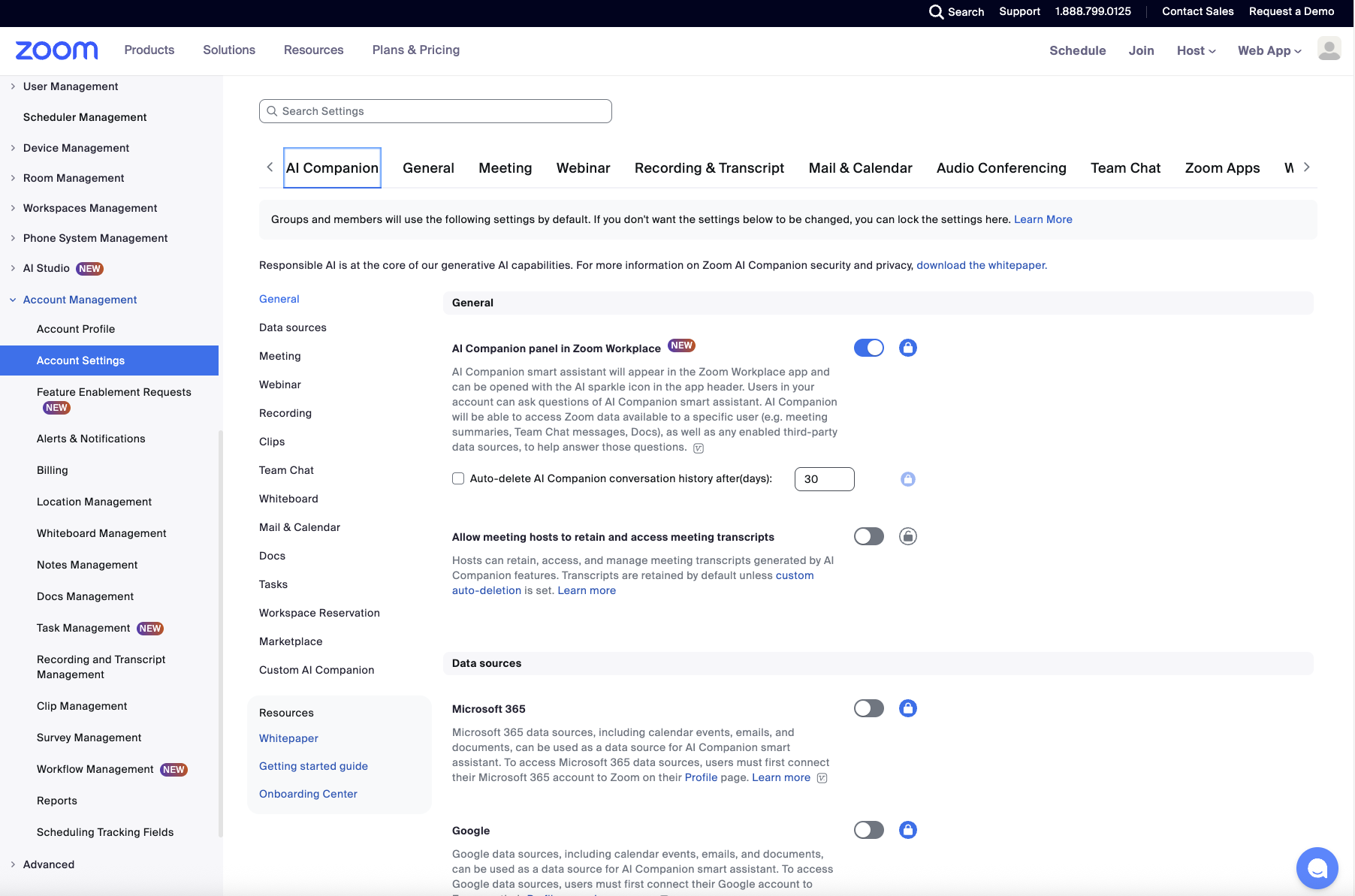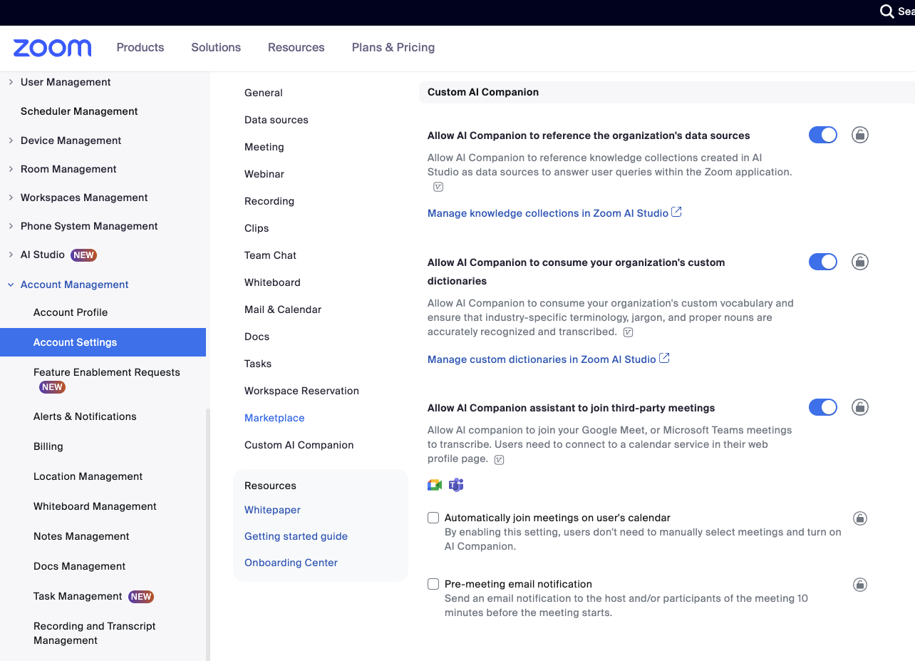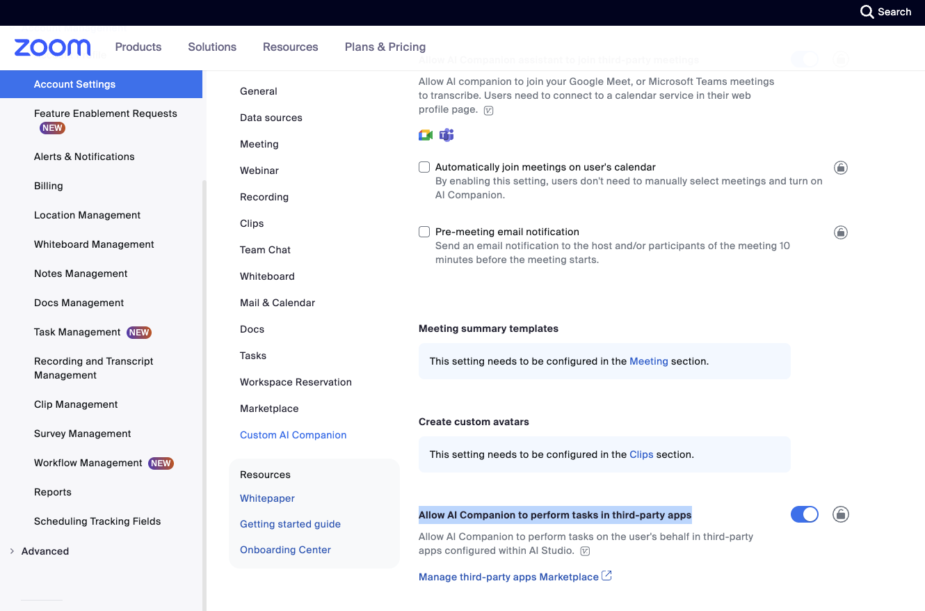 Login to Zoom.us as Administrator. Go to Account Management → Account Settings. Ensure that the AI Companion panel in Zoom Workplace is on.