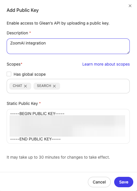 - Copy the Public Key to a safe spot. Do not click submit until Glean portion of setup is complete.