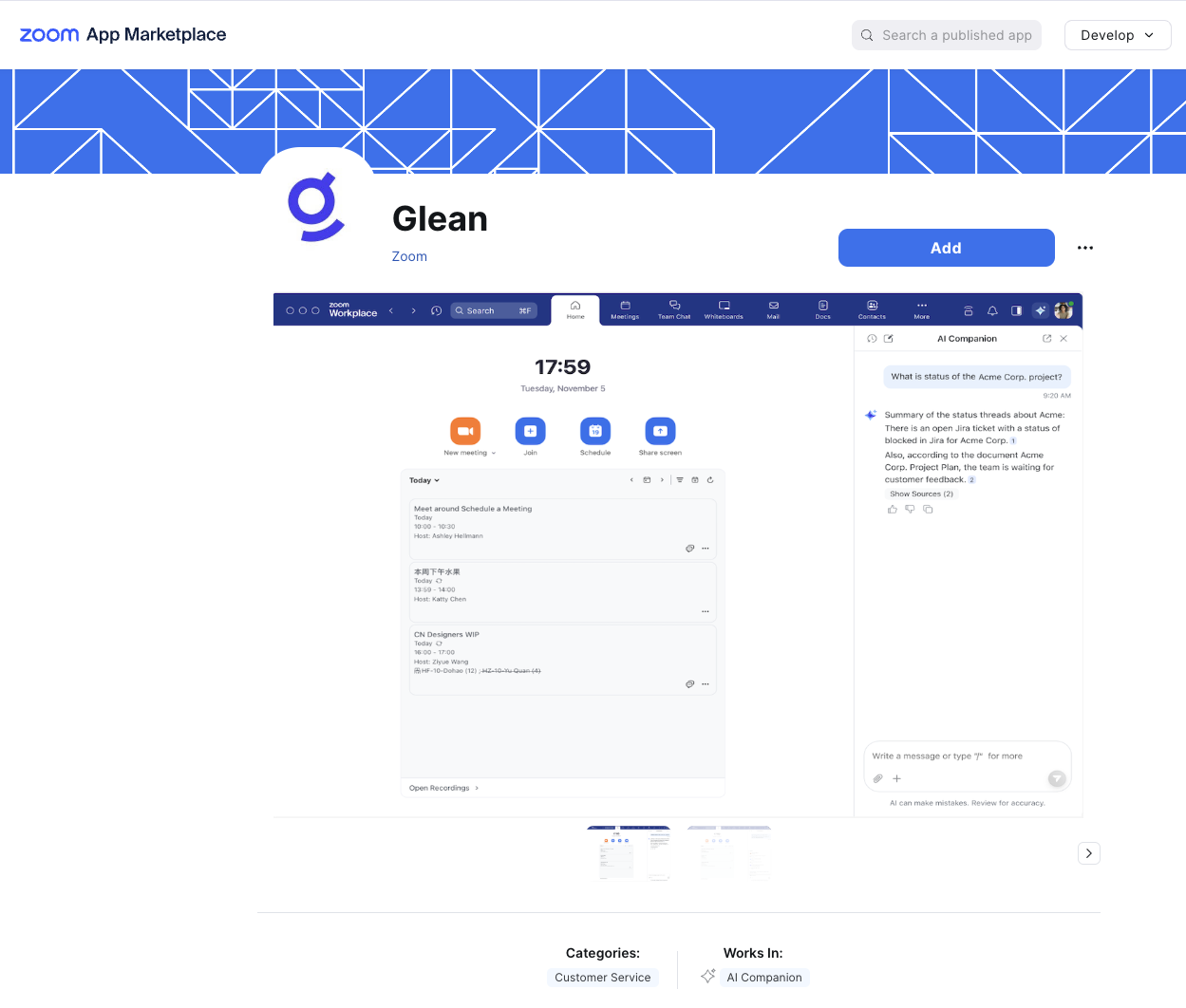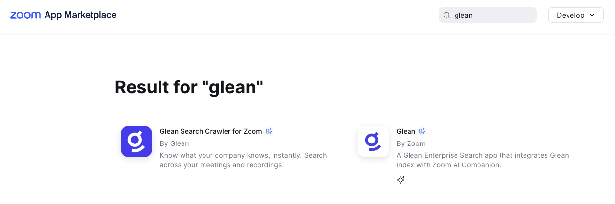 Search for Glean in the upper-right search bar. Then click Glean by Zoom, with the description of "A Glean Enterprise Search app that integrates Glean index with Zoom AI companion."