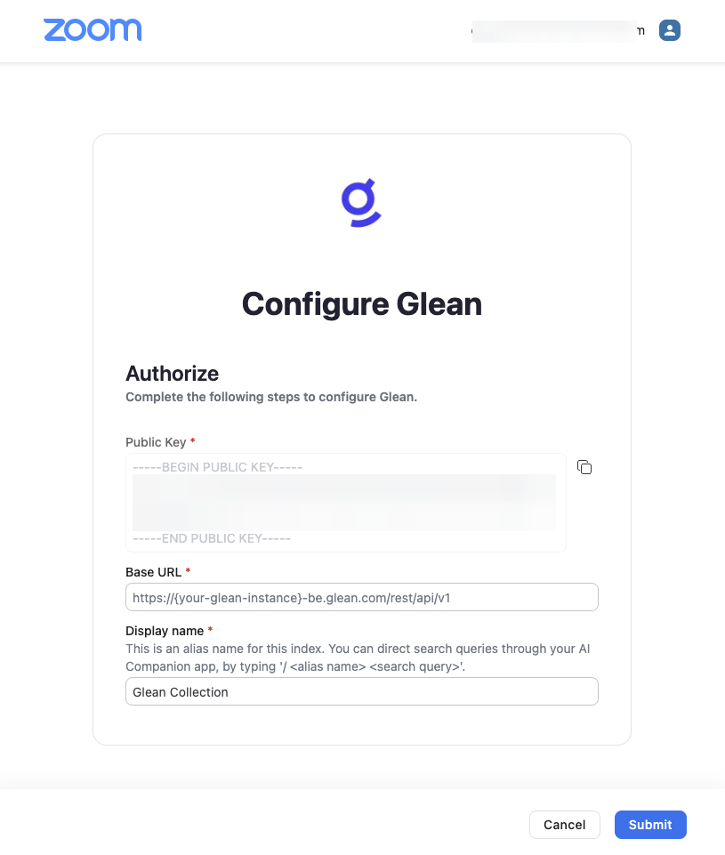 - Click Submit on Glean app in Zoom Marketplace