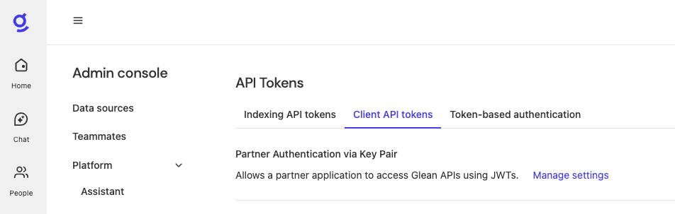 - Navigate to Admin Console → Platform → API Tokens → Client API tokens → Partner Authentication via Key Pair → Manage settings.