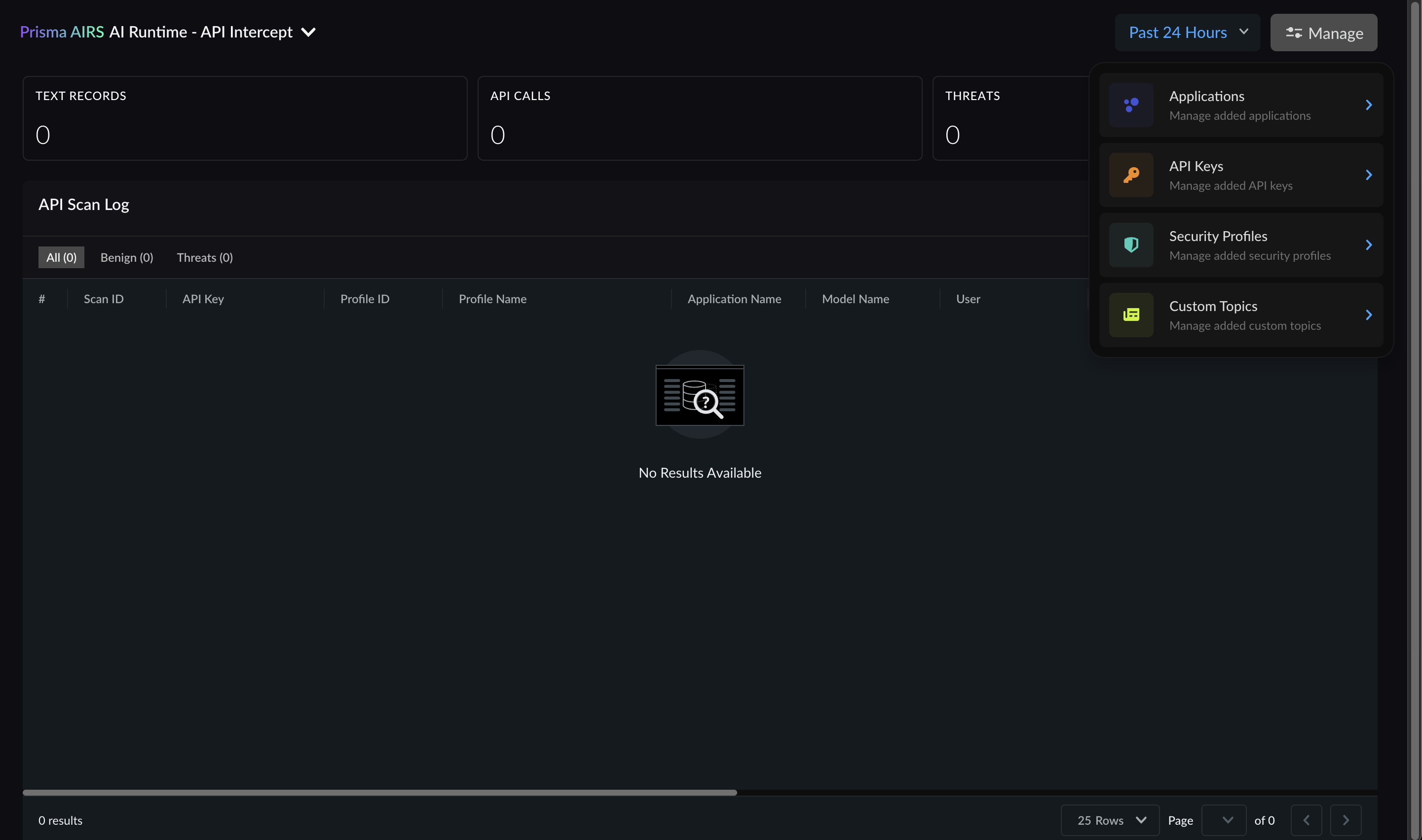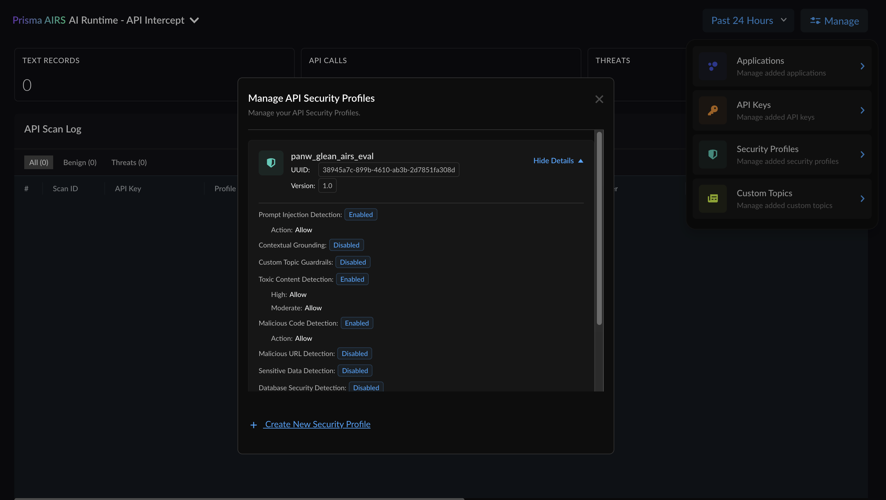 Before generating the API key, you first need to create a security profile in the PANW Prisma AIRS dashboard.- Log in to the PANW Prisma AIRS dashboard and navigate to AI Runtime - API Intercept.