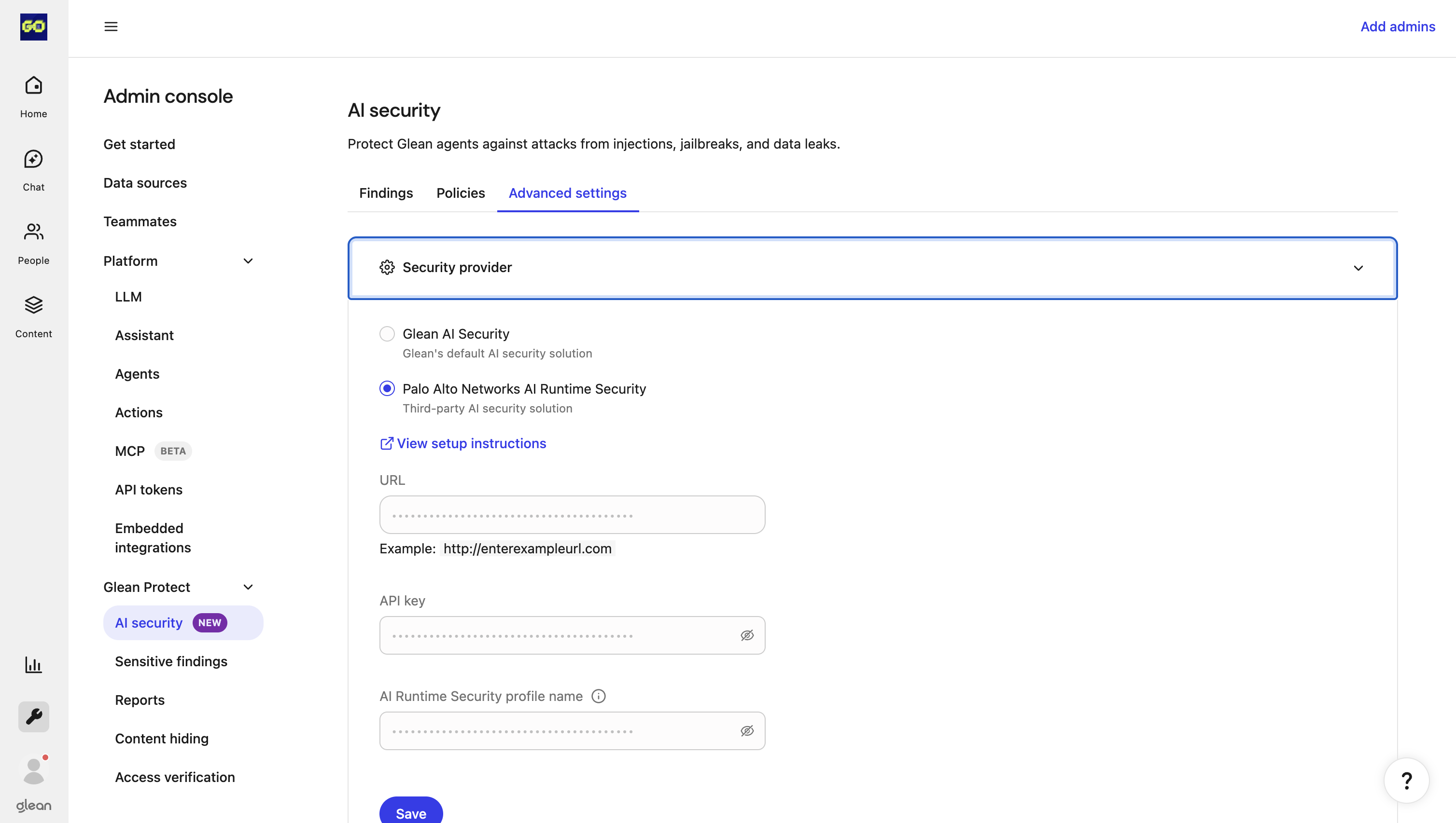 To configure the PANW provider in Glean, follow these steps:- In the Glean Admin Console, navigate to Glean Protect > AI security and click the Advanced Settings tab.