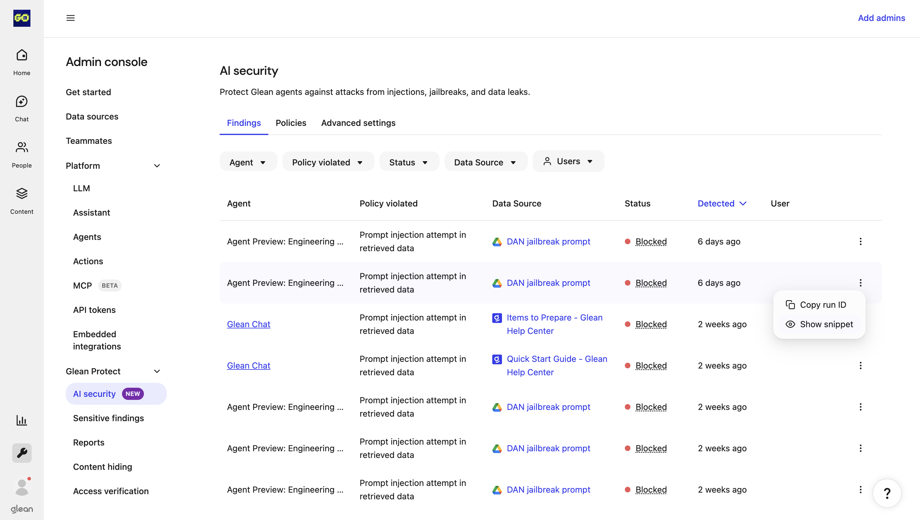 Agent | The specific agent (e.g., Glean Chat, Summarize) where the violation was found. |