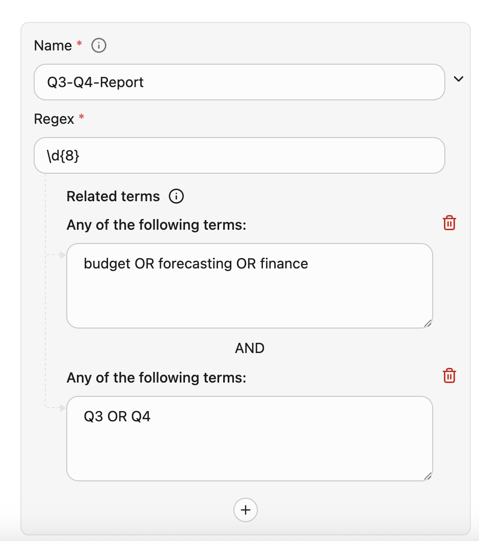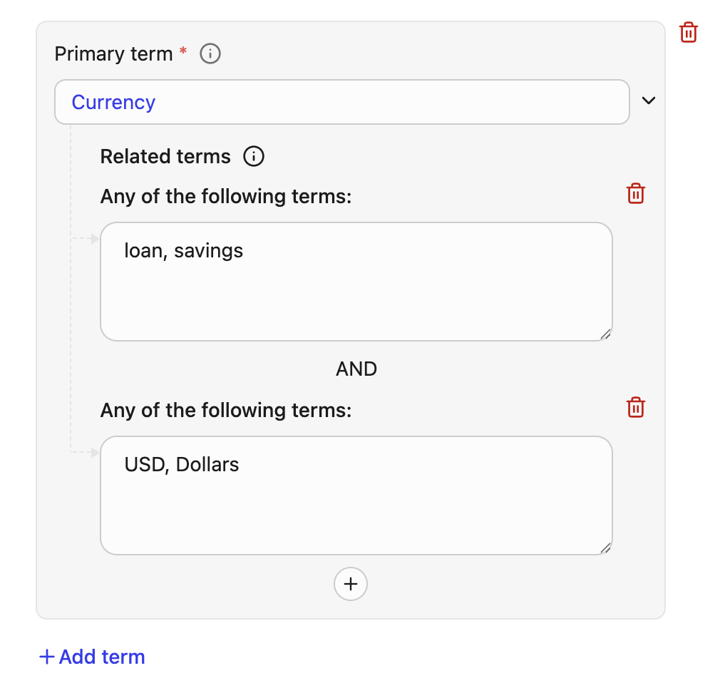 You can add additional sets of related terms to refine your matches and reduce false positives. The primary term is flagged as sensitive only after all the defined related term conditions are met.Component Description Evaluation logic Term set (e.g., loan, savings)A list of related words separated by commas. OR relationship. Only the presence of one term from the set is required. Term condition (Two or more sets) Multiple term sets evaluated together. AND relationship. The presence of a match from each defined set is required for the primary term to be flagged. Example: Primary term
