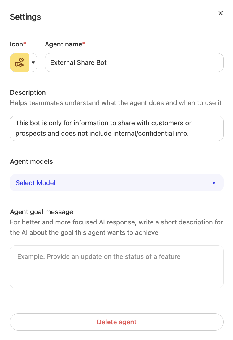 The Glean Model Hub enables you to experiment with and select the most suitable model for each agent and its respective steps. This selection of models allows organizations to flexibly experiment with, choose, and combine leading AI models for each step of their workflows, ensuring data safety, rapid access to new models, and robust performance tracking. It also empowers businesses to optimize AI performance and cost without vendor lock-in or management overhead. For more information on accessing the model hub, please refer to the Set up LLMs article.Agent goal message