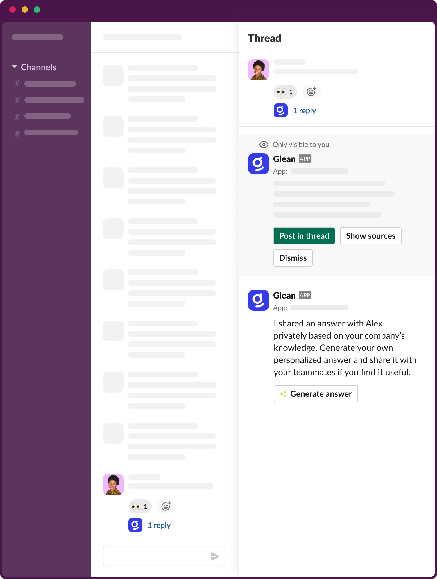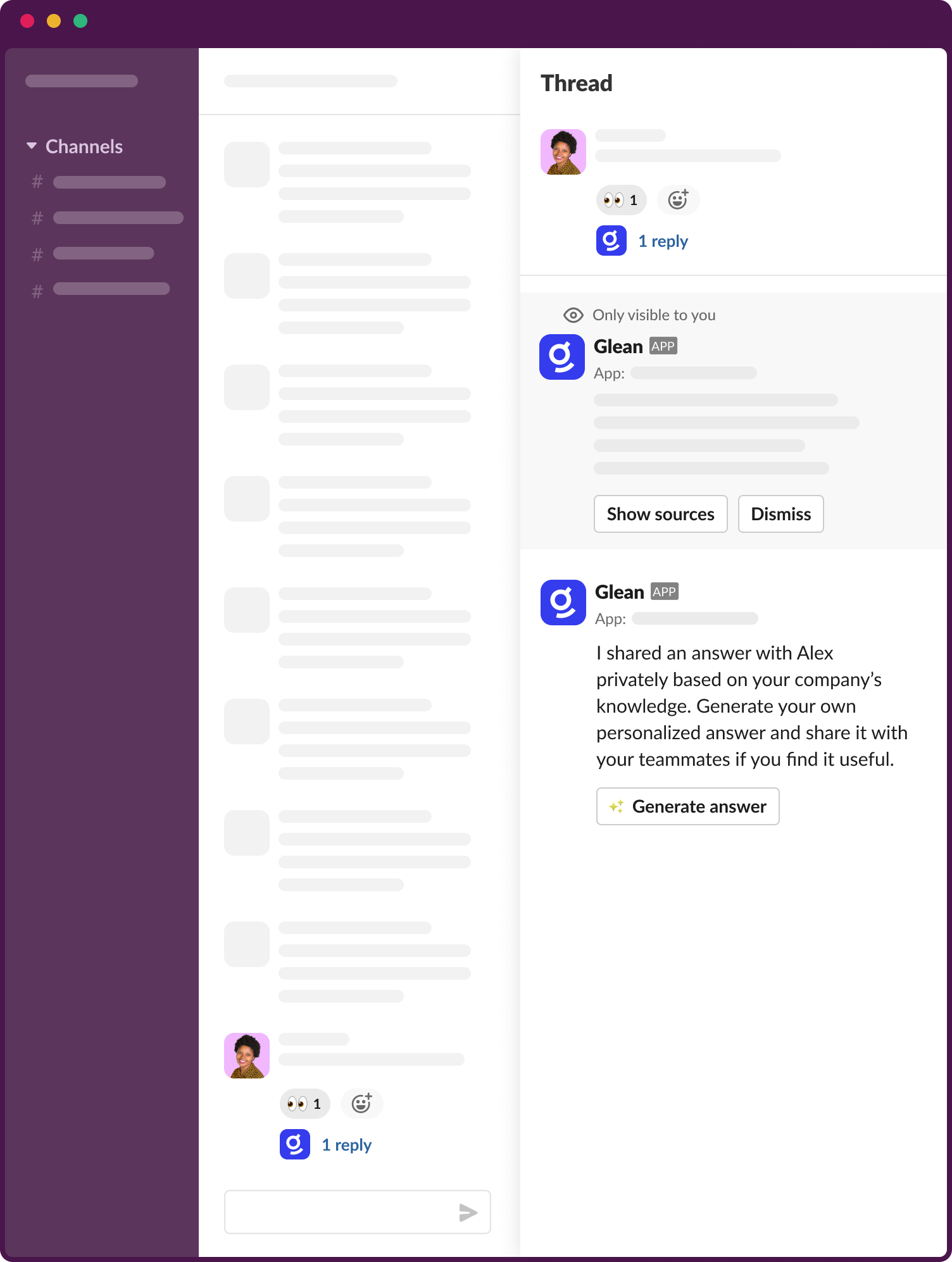 Agent replies with an answer that is visible to everyone in the channel. Glean will only use sources that everyone in the channel can view to generate responses.