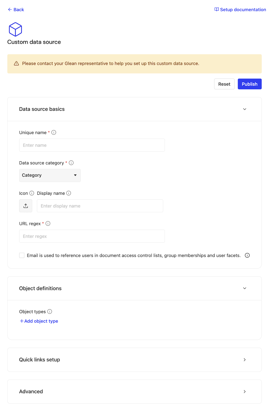 To set up a custom data source, follow the steps in Glean developer documentation. If you have any questions, you can ask in the Glean developer community.
