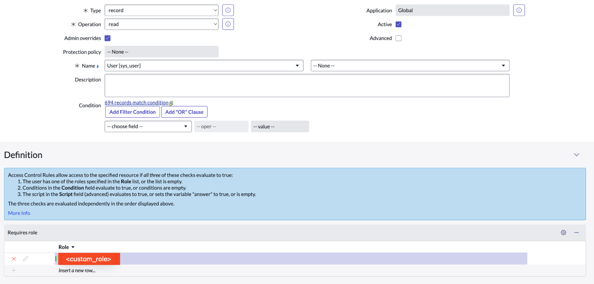 CustomRolethe read record access. You also need to provide the read access for all fields of the table, which is done in a separate ACL Rule. Ultimately, you will create two ACL Rules for each of the following tables:sys_usersys_user_rolesys_user_has_rolesys_user_groupsys_user_grmemberuser_criteriakb_knowledgekb_knowledge_basekb_uc_can_read_mtomkb_uc_cannot_read_mtomkb_uc_can_contribute_mtomkb_uc_cannot_contribute_mtomkb_categorykb_usesc_cat_itemsc_cat_item_user_criteria_mtomsc_cat_item_user_criteria_no_mtomsc_categorysc_catalogtopicsys_audit_delete(if provided access)incident(if enabled)cmdb_ci_business_app(if enabled)dmn_demand(if enabled)pm_project(if enabled)rm_epic(if enabled)