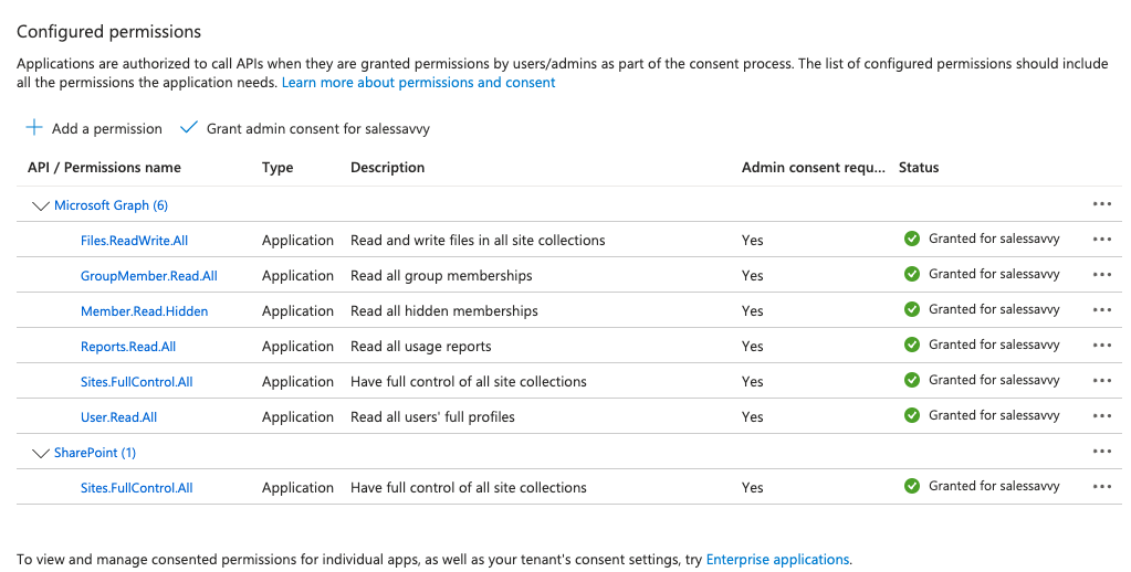 Click on Permissions under Security. Review the permissions shown, and click Grant admin consent.