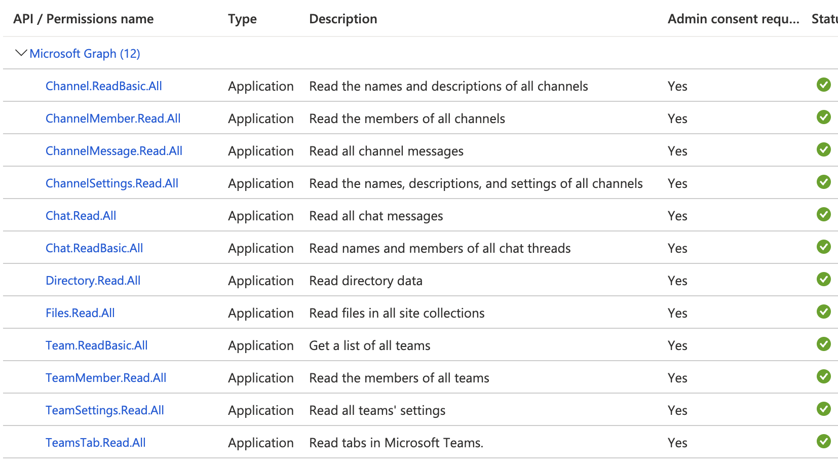 User.Read.AllGroupMember.Read.AllTeam.ReadBasic.AllTeamMember.Read.AllTeamSettings.Read.AllTeamsTab.Read.AllChannel.ReadBasic.AllChannelMember.Read.AllChannelMessage.Read.AllChannelSettings.Read.AllChat.Read.AllChat.ReadBasic.All(Used only for private messagesFiles.Read.All