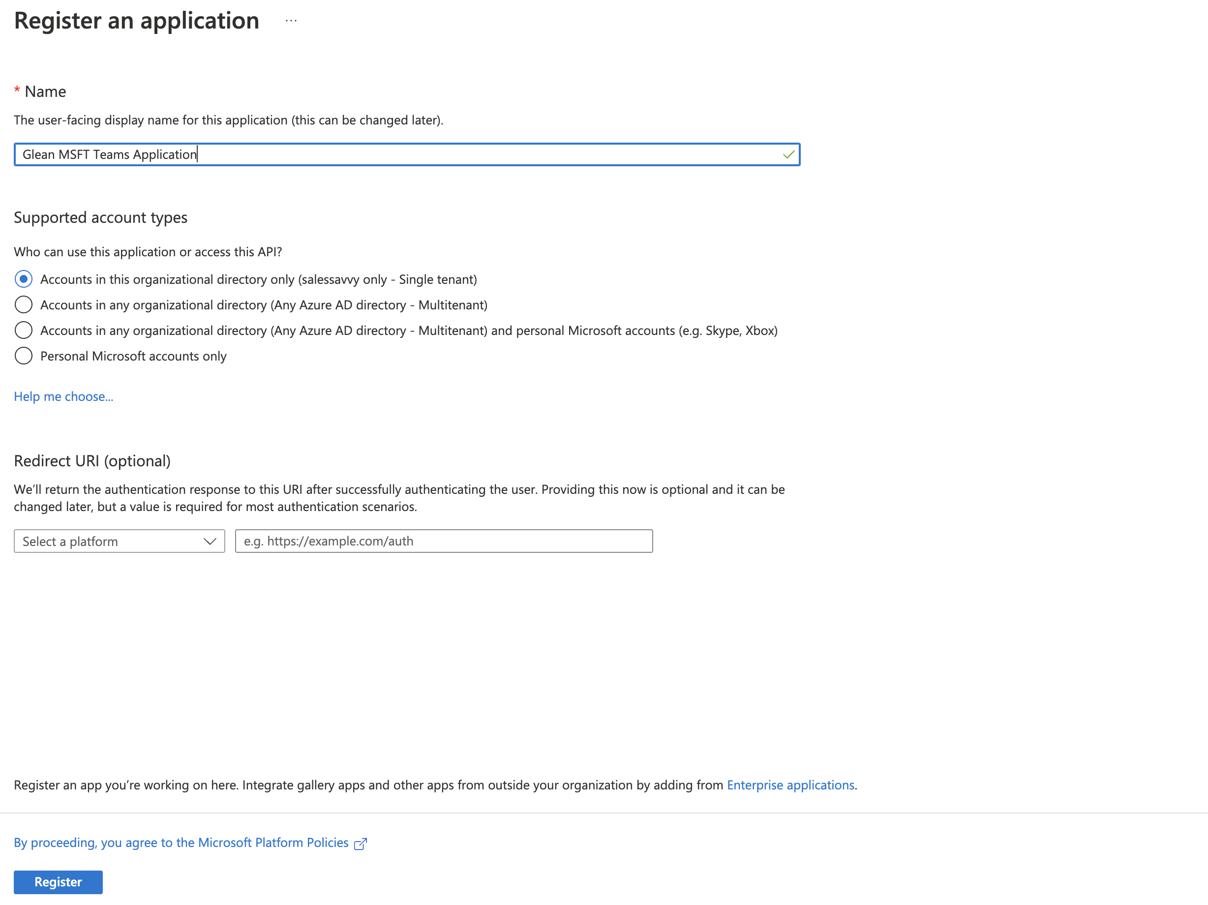 Field Value Name Glean MSFT Teams App (for messages)Supported account types Accounts in this organizational directory only (Single tenant) Redirect URI (Leave this field blank) -