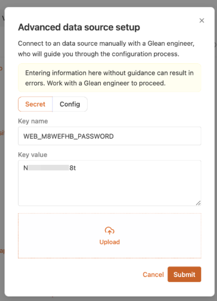 - On the same URL - https://app.glean.com/admin/setup/apps?advanced add the Key name “WEB_M8WEFHB_PASSWORD” followed by the Key Value as the password.