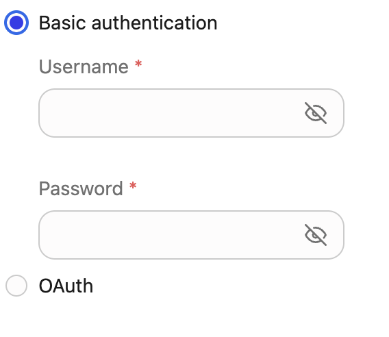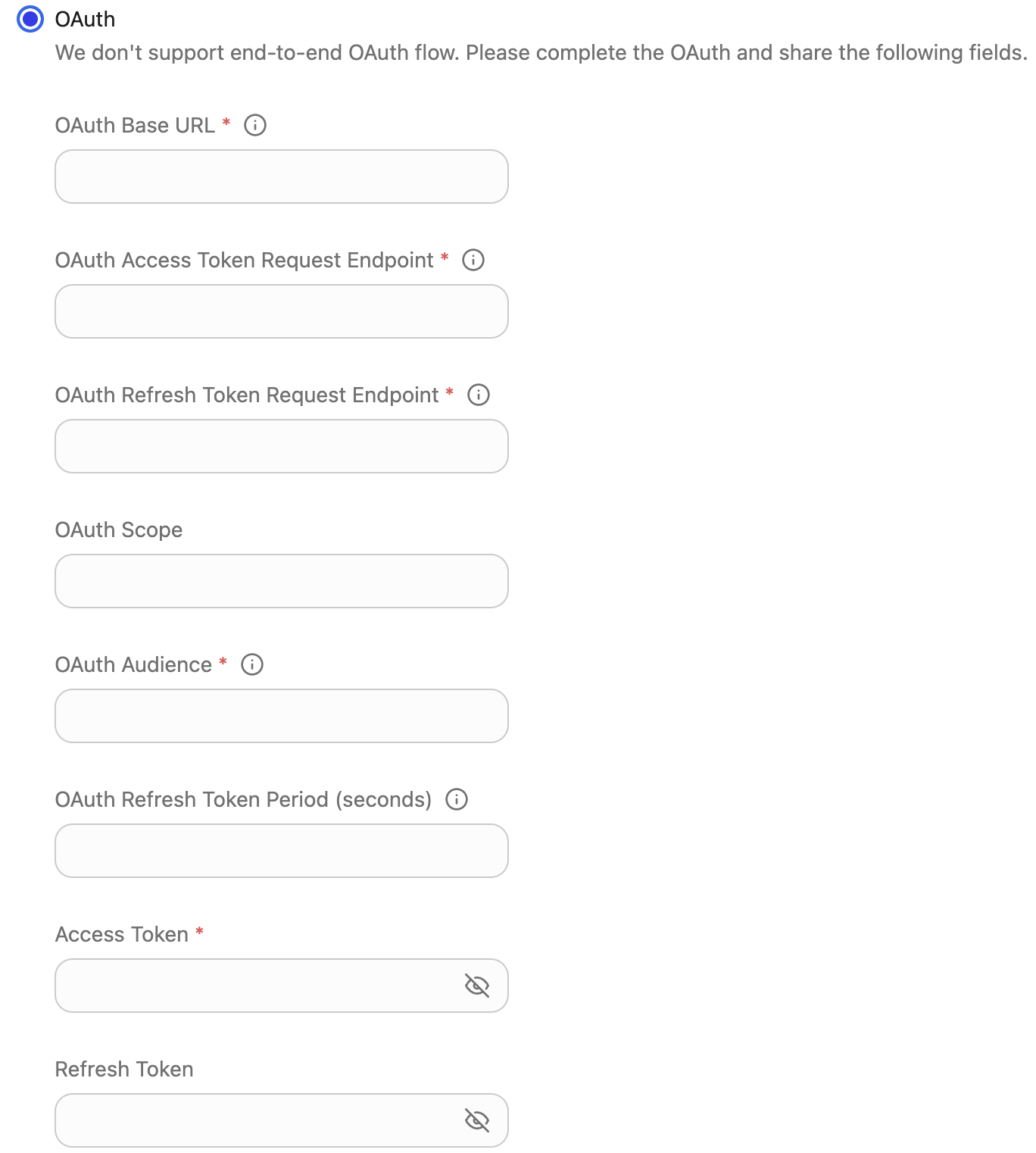 - OAuth: Provide your OAuth values after completing OAuth with your identity provider.