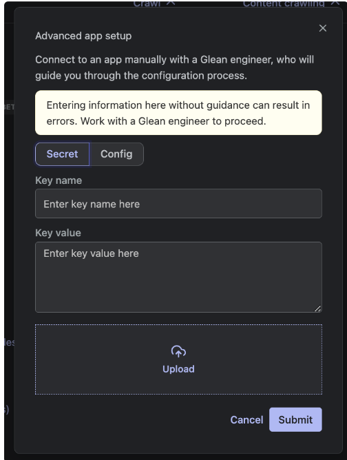 You can use the advanced application of Glean to set configuration variables and secrets in configuration management system of Glean or the secret store respectively.