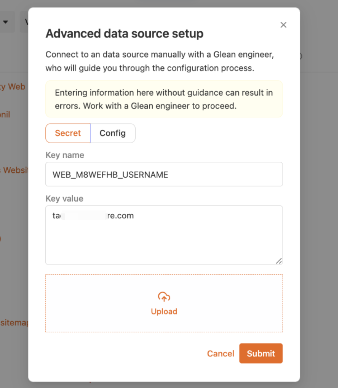 Open the URL - https://app.glean.com/admin/setup/apps?advanced and add the Key name "WEB_M8WEFHB_USERNAME" followed by the key value as the user email ID.