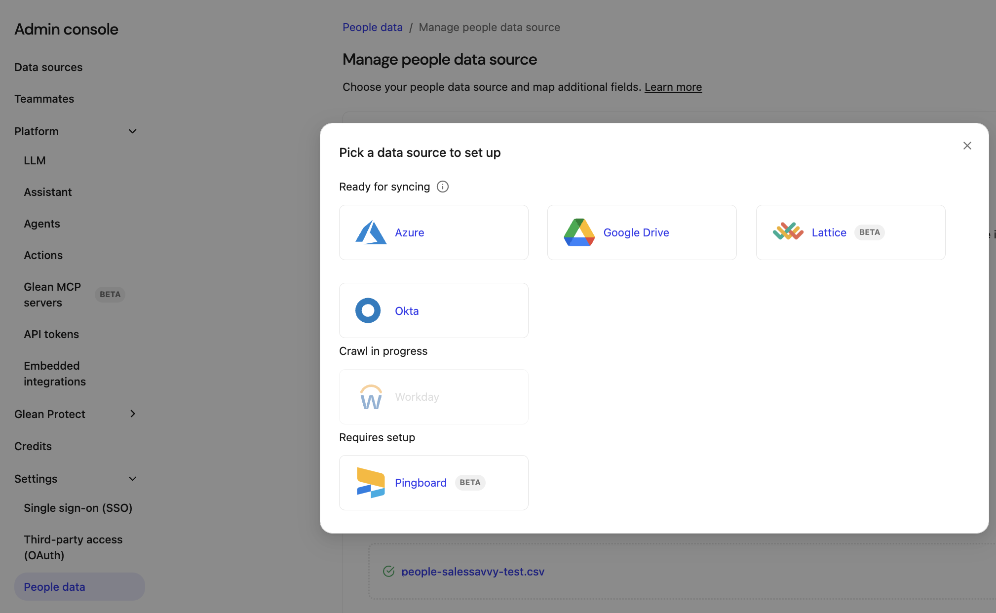 - In the Glean Admin console, navigate to Settings and select People data.