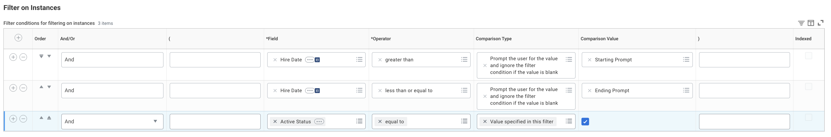 In the Filter tab, configure date-based filters using "Hire Date" for pagination and the "Active Status" field to filter for active users.