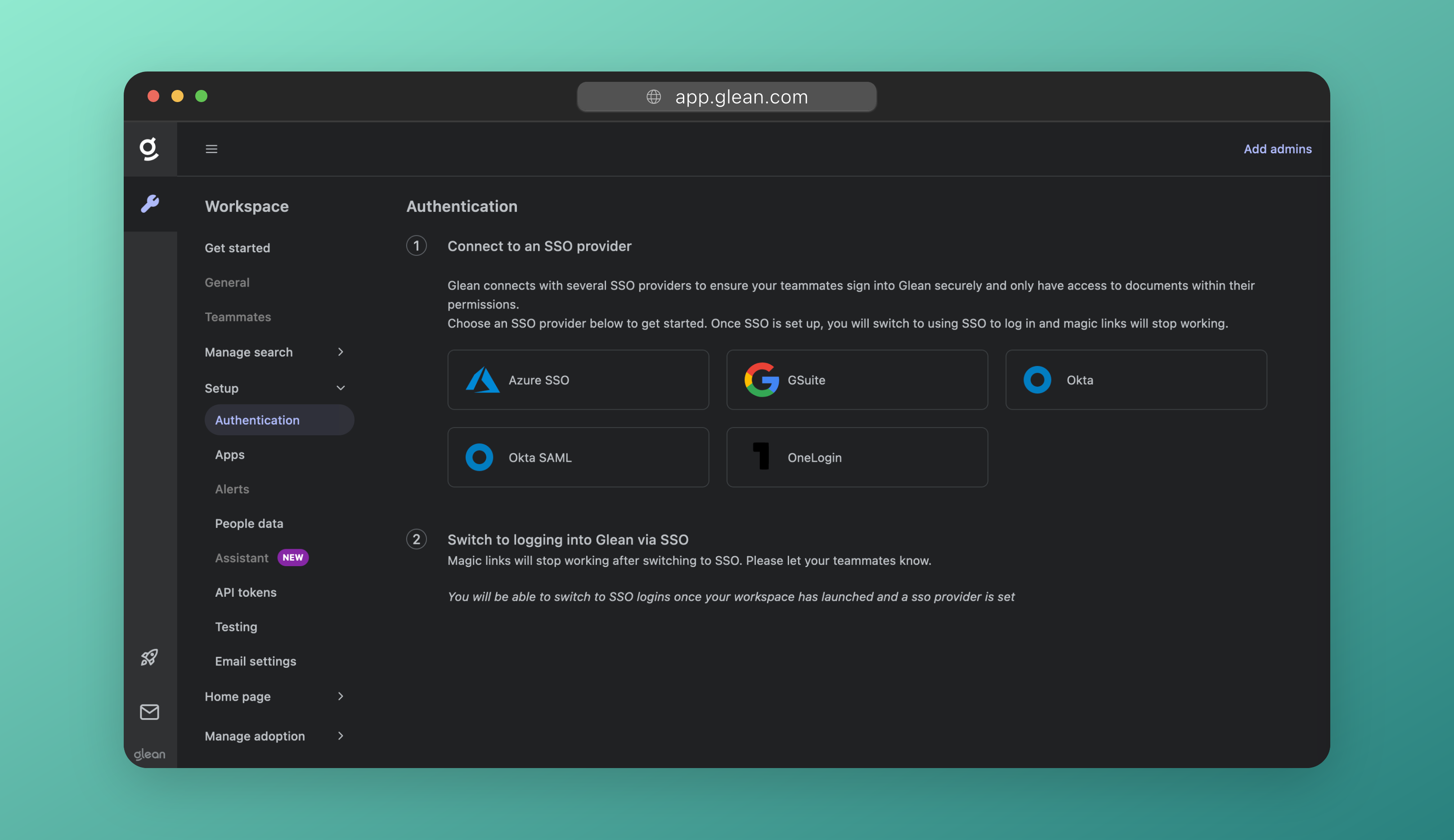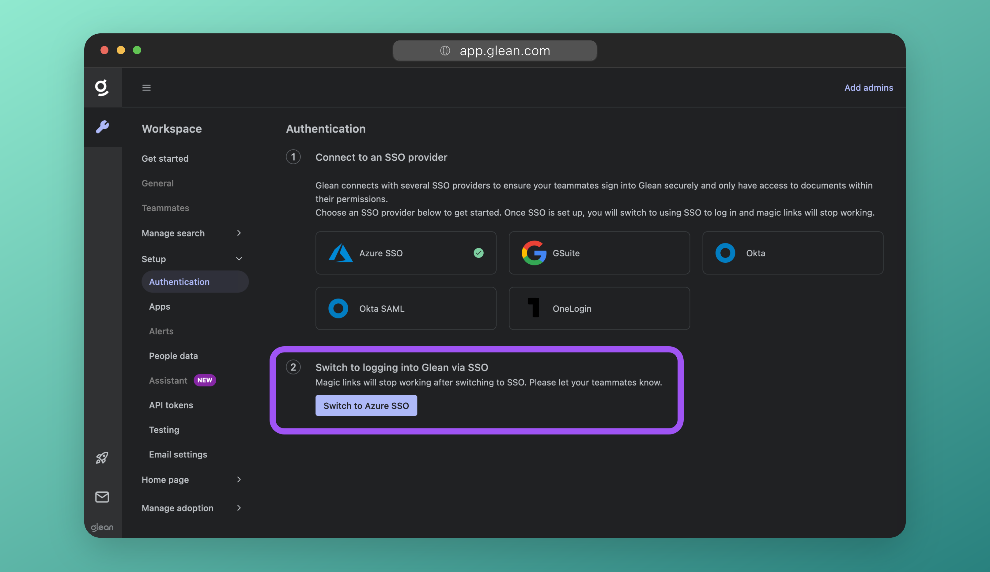 Once you have configured SSO, you will need to tell Glean to switch from using Magic Links to SSO for user and administrator sign-in.