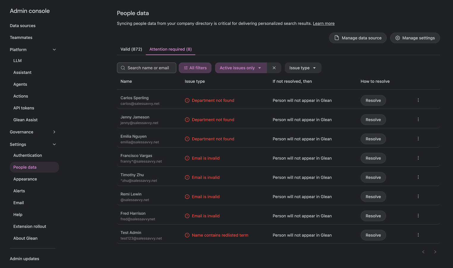 Glean can encounter issues when synchronizing certain people from your directory. Common issues include: