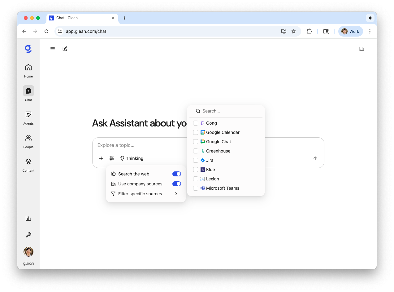Users can simply describe what they need in natural language—including whether it should focus on or exclude a specific data source—and Assistant will automatically execute. Users can continue to filter specific sources in search. (Glean ID: ROAD-938)