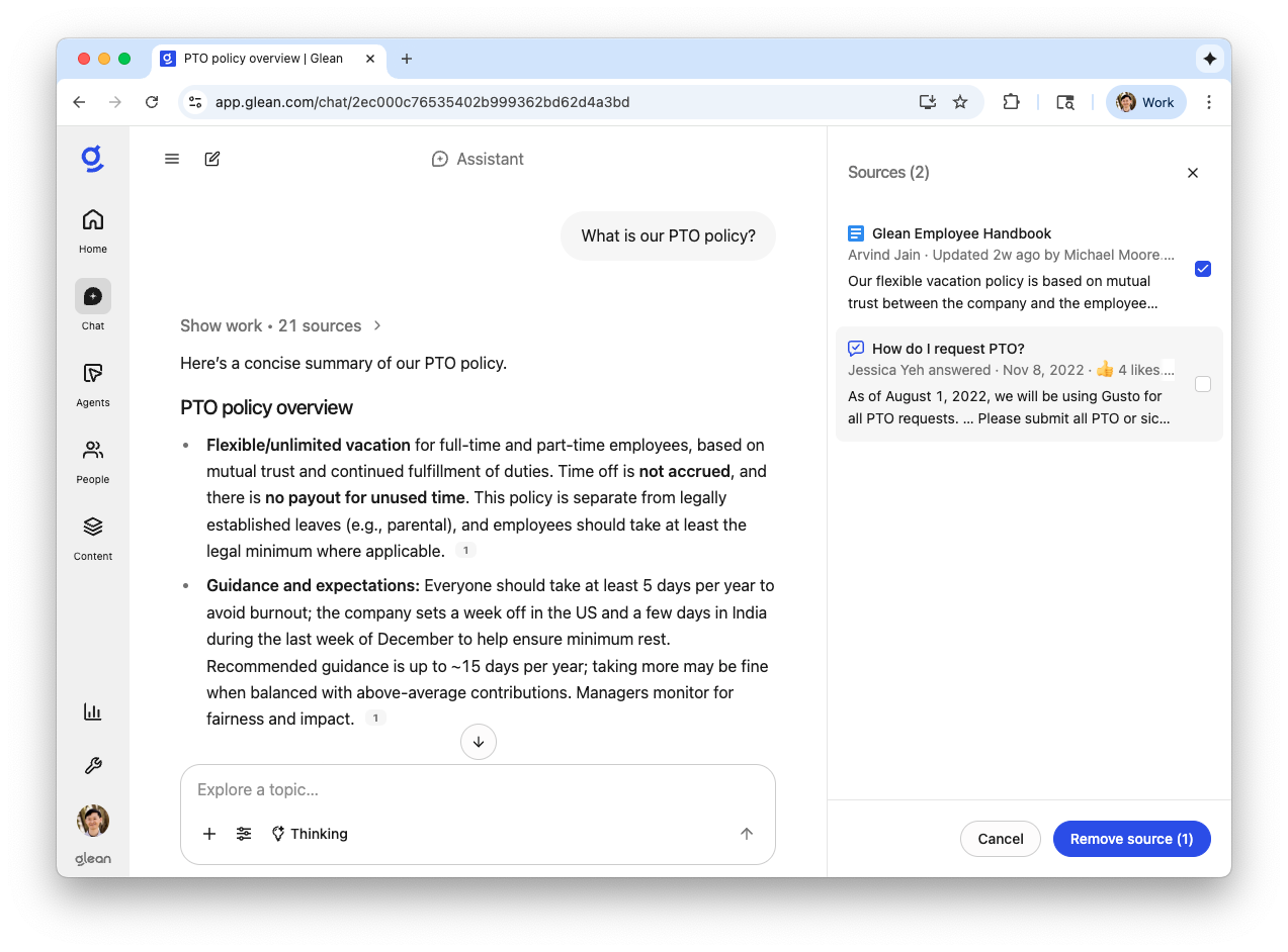 Two features in Glean Assistant will no longer be available after December 2, 2025. These are the ability to filter specific sources in chat and the option to remove sources from existing Assistant responses. These features are being removed to streamline the user experience and because the latest generation of Glean Assistant, powered by advanced LLMs like GPT-5 and Claude Sonnet 4.5, now provides more accurate, context-aware answers without requiring manual source selection.
