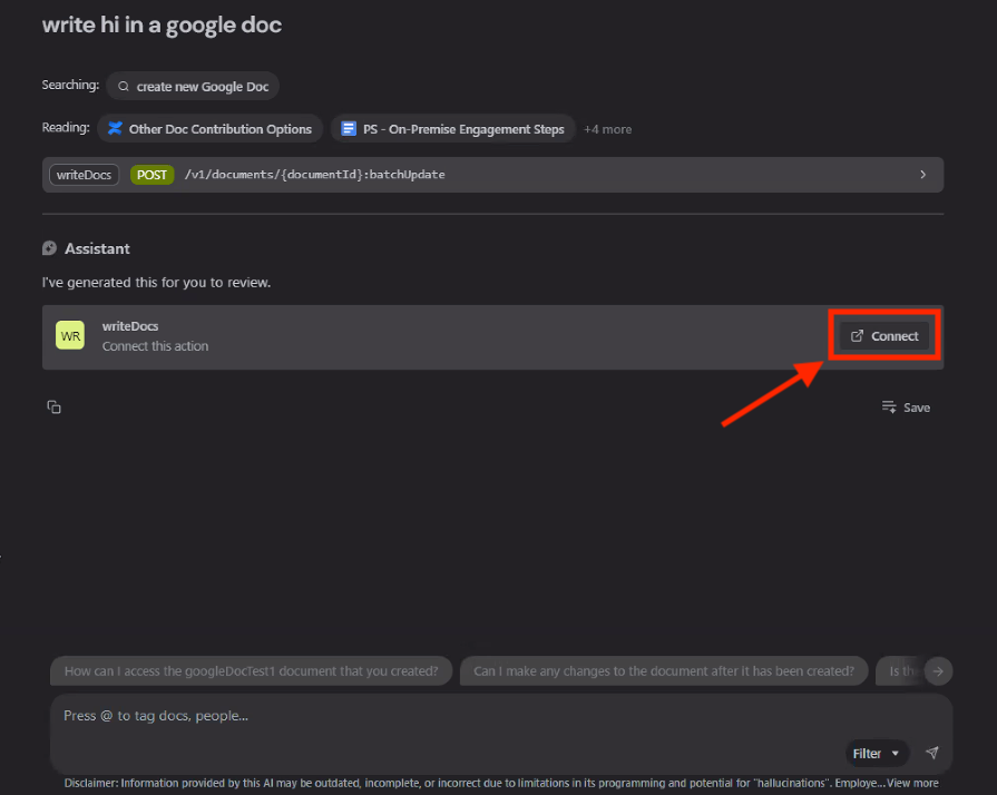 For example: https://acmeco-be.glean.com/tools/oauth/verify_code/CreateGoogleDoc