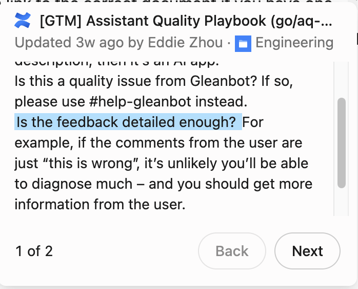 A citation is a reference to a source Glean Chat used. It includes a brief pointer to the document, allowing you to locate and evaluate the information. A deep-linked citation links directly to the exact passage that supports the statement. This allows you to instantly verify the response and explore the surrounding context without searching the entire document.
