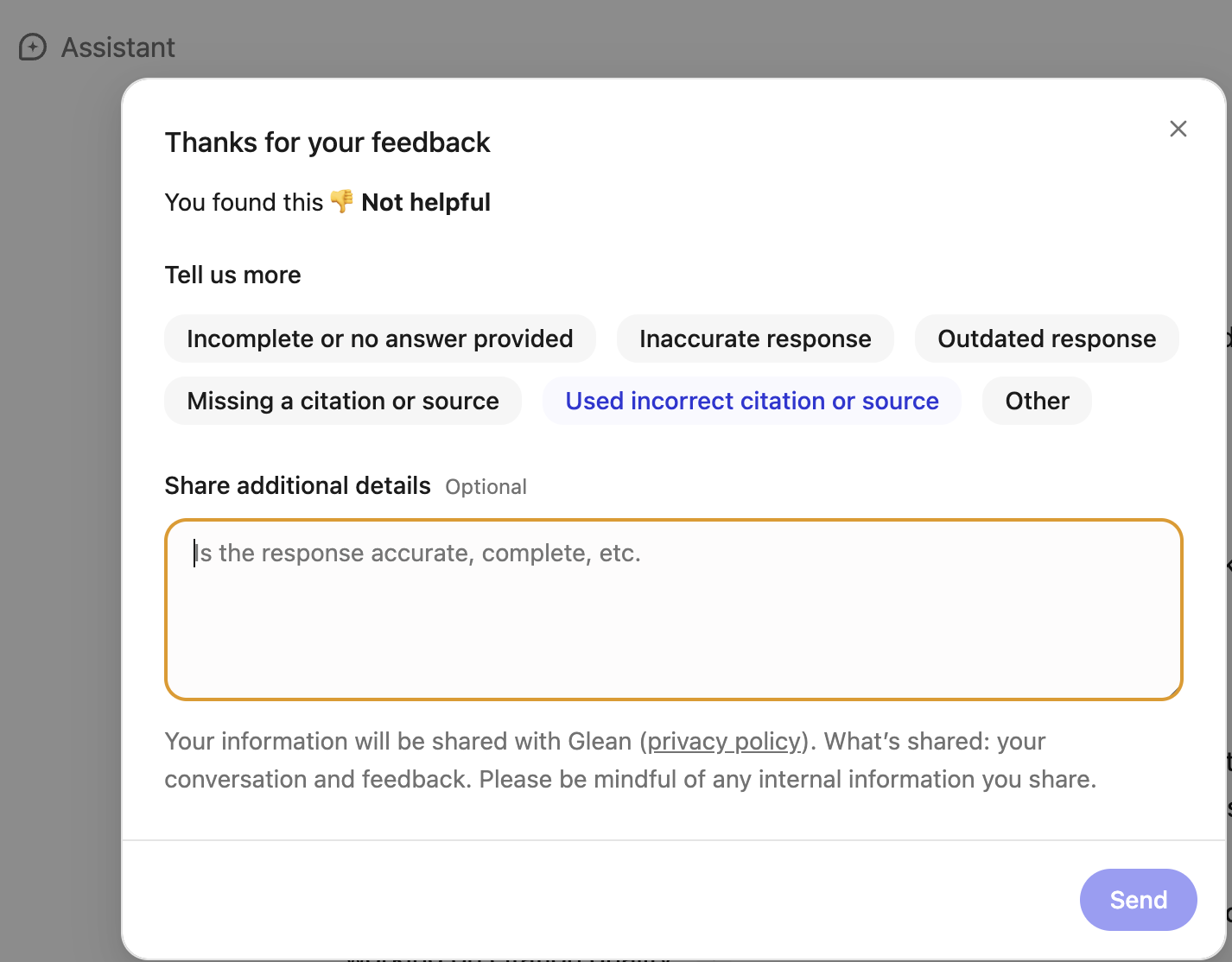 Incorrect or low‑quality citations: If you see incorrect citations, share your feedback by clicking on the thumbs down button and select the category as Used incorrect citation or source.