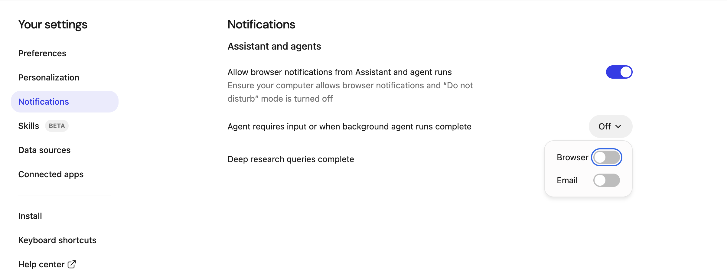 - A Deep Research query completes in the background, you get a browser notification if enabled.