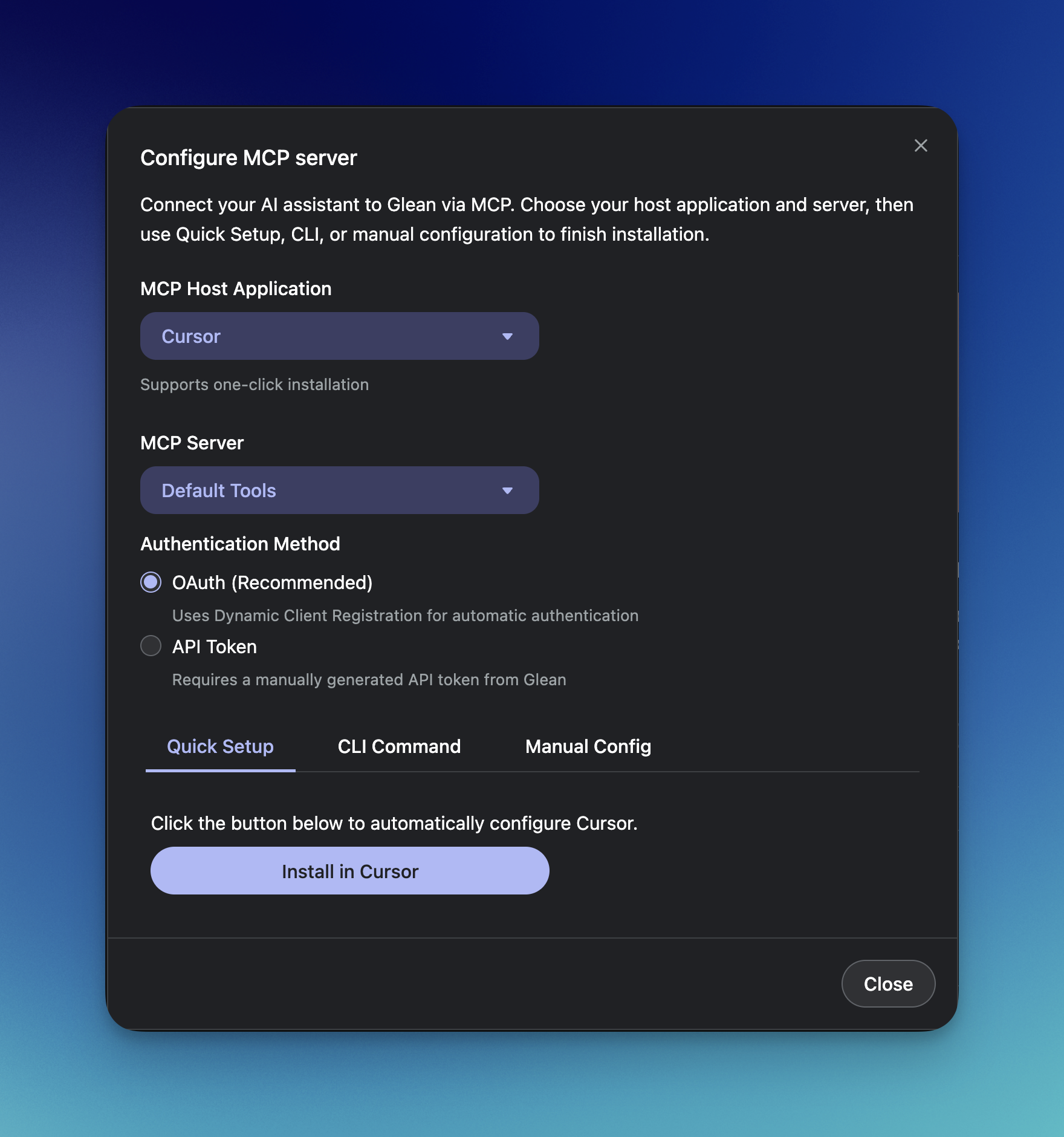 Follow these steps to connect your MCP host to Glean using the MCP Configurator. The configurator provides host‑specific instructions and URLs.
